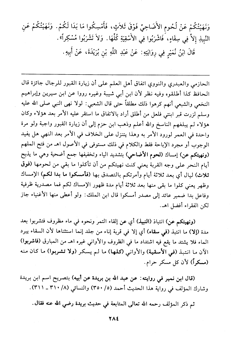 وَنَهَيتُكُمْ عَنْ لُحُومِ الأضَّاحِيِّ فَوْقَ ثَلَاثٍ، فَأَمْسِكُوا مَا بَدَا لَكُمْ. وَنَهَيتُكُمْ عَنِ النَّبِيذِ إلا في سِقَاءٍ، فَاشْرَبُوا في الأسقِيَةِ كُلِّهَا. وَلَا تَشْرَبُوا مُسْكِرًا".