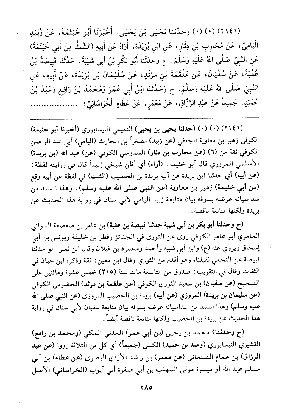 (٢١٤١) (٠) (٠) (حَدَّثَنَا يحيى بن يحيى) التميمي النيسابوري (أخبرنا أبو خثيمة) الكوفي زهير بن معاوية الجعفي (عن زبيد) مصغرًا بن الحارث (اليامي) أبي عبد الرحمن الكوفي ثقة من (٦) (عن محارب بن دثار) السدوسي الكوفي (عن) عبد الله (بن بريدة) الأسلمي المروزي قال أبو خثيمة: (أراه) أي أظن شيخي زبيدًا قال في روايته لفظة: (عن أبيه) أي حَدَّثَنَا ابن بريدة عن أبيه بريدة بن الحصيب (الشك) في لفظة عن أبيه وقع (من أبي خثيمة) زهير بن معاوية (عن النبي صلى الله عليه وسلم). وهذا السند من سداسياته غرضه بسوقه بيان متابعة زبيد اليامي لأبي سنان في رواية هذا الحديث عن بريدة ولكنها متابعة ناقصة.
