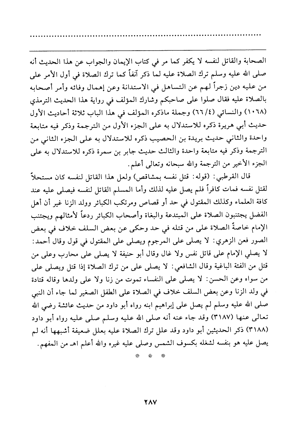 قال القرطبي: (قوله: قتل نفسه بمشاقص) ولعل هذا القاتل لنفسه كان مستحلًا لقتل نفسه فمات كافرًا فلم يصل عليه لذلك وأما المسلم القاتل لنفسه فيصلى عليه عند كافة العلماء وكذلك المقتول في حد أو قصاص ومرتكب الكبائر وولد الزنا غير أن أهل الفضل يجتنبون الصلاة على المبتدعة والبغاة وأصحاب الكبائر ردعًا لأمثالهم ويجتنب الإمام خاصة الصلاة على من قتله في حد وحكى عن بعض السلف خلاف في بعض الصور فعن الزهري: لا يصلى على المرجوم ويصلى على المقتول في قول وقال أحمد: لا يصلي الإمام على قاتل نفس ولا غال وقال أبو حنيفة لا يصلى على محارب وعلى من قتل من الفئة الباغية وقال الشافعي: لا يصلى على من ترك الصلاة إذا قتل ويصلى على من سواه وعن الحسن: لا يصلى على النفساء تموت من زنا ولا على ولدها وقاله قتادة في ولد الزنا وعن بعض السلف خلاف في الصلاة على الطفل الصغير لما جاء أن النبي صلى الله عليه وسلم لم يصل على إبراهيم ابنه رواه أبو داود من حديث عائشة رضي الله تعالى عنها (٣١٨٧) وقد جاء عنه أنَّه صلى الله عليه وسلم صلى عليه رواه أبو داود (٣١٨٨) ذكر الحديثين أبو داود وقد علل ترك الصلاة عليه بعلل ضعيفة أشبهها أنَّه لم يصل عليه هو بنفسه لشغله بكسوف الشمس وصلى عليه غيره والله أعلم اهـ من المفهم.