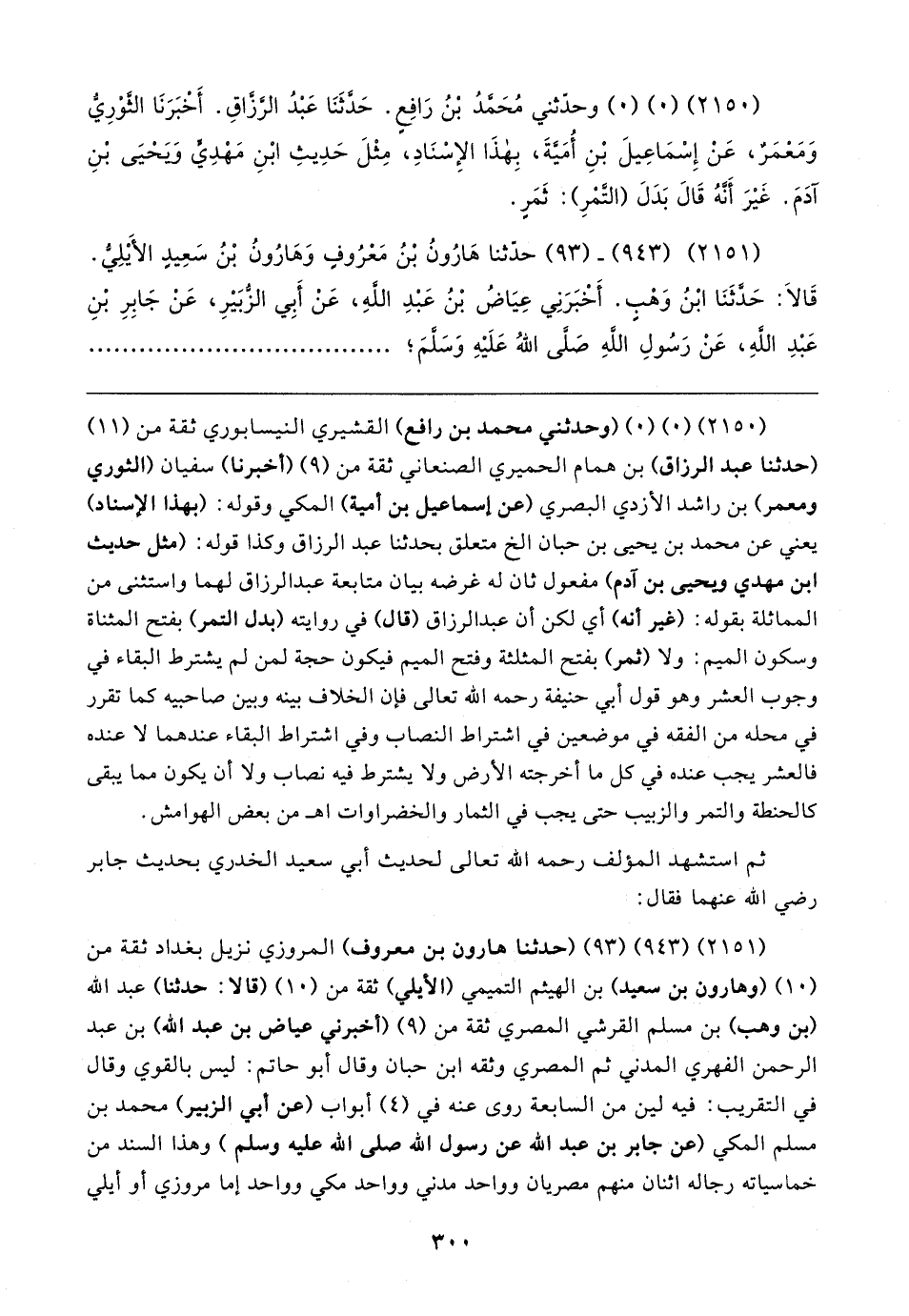 (٢١٥٠) (٠) (٠) (وحدثني محمد بن رافع) القشيري النيسابوري ثقة من (١١) (حَدَّثَنَا عبد الرزاق) بن همام الحميري الصنعاني ثقة من (٩) (أخبرنا) سفيان (الثوري ومعمر) بن راشد الأزدي البصري (عن إسماعيل بن أمية) المكي وقوله: (بهذا الإسناد) يعني عن محمد بن يحيى بن حبان الخ متعلق بحدثنا عبد الرزاق وكذا قوله: (مثل حديث ابن مهدي ويحيى بن آدم) مفعول ثان له غرضه بيان متابعة عبد الرزاق لهما واستثنى من المماثلة بقوله: (غير أنَّه) أي لكن أن عبد الرزاق (قال) في روايته (بدل التمر) بفتح المثناة وسكون الميم: ولا (ثمر) بفتح المثلثة وفتح الميم فيكون حجة لمن لم يشترط البقاء في وجوب العشر وهو قول أبي حنيفة رحمه الله تعالى فإن الخلاف بينه وبين صاحبيه كما تقرر في محله من الفقه في موضعين في اشتراط النصاب وفي اشتراط البقاء عندهما لا عنده فالعشر يجب عنده في كل ما أخرجته الأرض ولا يشترط فيه نصاب ولا أن يكون مما يبقى كالحنطة والتمر والزبيب حتَّى يجب في الثمار والخضراوات اهـ من بعض الهوامش.