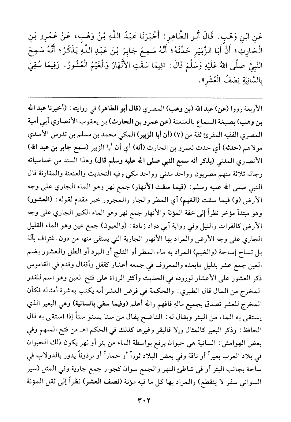 الأربعة رووا (عن) عبد الله (بن وهب) المصري (قال أبو الطاهر) في روايته: (أخبرنا عبد الله بن وهب) بصيغة السماع بالعنعنة (عن عمرو بن الحارث) بن يعقوب الأنصاري أبي أمية المصري الفقيه المقرئ ثقة من (٧) (أن أبا الزبير) المكي محمد بن مسلم بن تدرس الأسدي مولاهم (حدثه) أي حدث لعمرو بن الحارث (أنَّه) أي أن أبا الزبير (سمع جابر بن عبد الله) الأنصاري المدني (يذكر أنَّه سمع النبي صلى الله عليه وسلم قال) وهذا السند من خماسياته رجاله ثلاثة منهم مصريون وواحد مدني وواحد مكي وفيه التحديث والعنعنة والمقارنة قال النبي صلى الله عليه وسلم: (فيما سقت الأنهار) جمع نهر وهو الماء الجاري على وجه الأرض (و) فيما سقت (الغيم) أي المطر والجار والمجرور خبر مقدم لقوله: (العشور) وهو مبتدأ مؤخر نظرًا إلى خفة المؤنة والأنهار جمع نهر وهو الماء الكبير الجاري على وجه الأرض كالفرات والنيل وفي رواية أبي دواد زيادة: (والعيون) جمع عين وهو الماء القليل الجاري على وجه الأرض والمراد بها الأنهار الجارية التي يستقى منها من دون اغتراف بآلة بل تساح إساحة (والغيم) المراد به ماء المطر أو الثلج أو البرد أو الطل والعشور بضم العين جمع عشر بدليل مابعده والمعروف في جمعه أعشار كقفل وأقفال وقدم في القاموس ذكر العشور على الأعشار لوروده في الحديث وأكثر الرواة على فتح العين وهو اسم للقدر المخرج من المال قال الطبري: والحكمة في فرض العشر أنَّه يكتب بعشرة أمثاله فكان المخرج للعشر تصدق بجميع ماله فافهم والله أعلم (وفيما سقي بالسانية) وهي البعير الَّذي يستقى به الماء من البئر ويقال له: الناضح يقال من سنا يسنو سنًّا إذا استقى به قال الحافظ: وذكر البعير كالمثال وإلا فالبقر وغيرها كذلك في الحكم اهـ من فتح الملهم وفي بعض الهوامش: السانية هي حيوان يرفع بواسطة الماء من بئر أو نهر يكون ذلك الحيوان في بلاد العرب بعيرًا أو ناقة وفي بعض البلاد ثورًا أو حمارًا أو برذونًا يدور بالدولاب في ساحة بجانب البئر أو في شاطئ النهر والجمع سوان كجوار جمع جارية وفي المثل (سير السواني سفر لا ينقطع) والمراد بها كل ما فيه مؤنة (نصف العشر) نظرًا إلى ثقل المؤنة