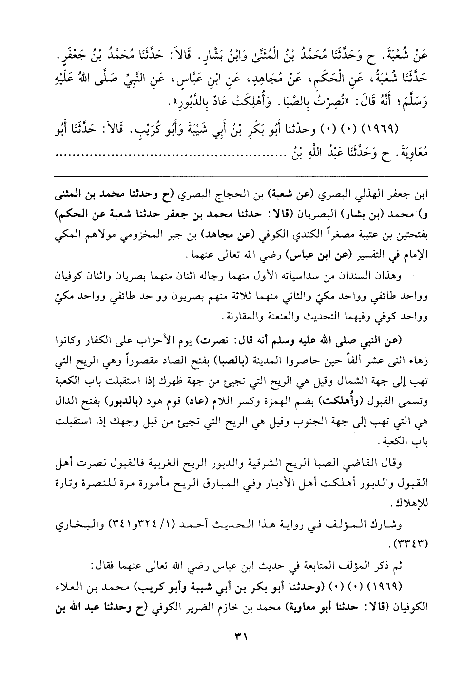 عَنْ شُعْبَةَ. ح وَحَدَّثَنَا مُحَمَّدُ بْنُ الْمُثَنَّى وَابْنُ بَشَّارٍ. قَالا: حَدَّثَنَا مُحَمَّدُ بْنُ جَعْفَرٍ. حَدَّثَنَا شُعْبَةُ، عَنِ الْحَكَمِ، عَنْ مُجَاهِدٍ، عَنِ ابْنِ عَبَّاسٍ، عَنِ النَّبِيِّ صلى الله عليه وسلم؛ أَنَّهُ قَال: "نُصِرْتُ بِالصَّبَا. وَأُهْلِكَتْ عَادٌ بِالدَّبُورِ".