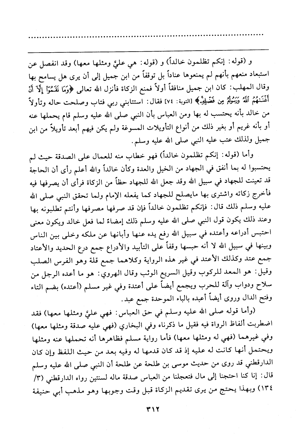 وأما (قوله: إنكم تظلمون خالدًا) فهو خطاب منه للعمال على الصدقة حيث لم يحتسبوا له بما أنفق في الجهاد من الخيل والعدة وكأن خالدًا والله أعلم رأى أن الحاجة قد تعينت للجهاد في سبيل الله وقد جعل الله للجهاد حظًّا من الزكاة فرأى أن يصرفها فيه فأخرج زكاته واشترى بها مايصلح للجهاد كما يفعله الإمام ولما تحقق النبي صلى الله عليه وسلم ذلك قال: فإنكم تظلمون خالدًا فإن قد صرفها مصرفها وأنتم تطلبونه بها وعند ذلك يكون قول النبي صلى الله عليه وسلم ذلك إمضاءً لما فعل خالد ويكون معنى احتبس أدراعه وأعتده في سبيل الله رفع يده عنها وأبانها عن ملكه وخلى بين الناس وبينها في سبيل الله لا أنَّه حبسها وقفًا على التأبيد والأدراع جمع درع الحديد والأعتاد جمع عتد وكذلك الأعتد في غير هذه الرواية وكلاهما جمع قلة وهو الفرس الصلب وقيل: هو المعد للركوب وقيل السريع الوثب وقال الهروي: هو ما أعده الرجل من سلاح ودواب وآلة للحرب ويجمع أيضًا على أعتدة وفي غير مسلم (أعتده) بضم التاء وفتح الدال وروى أيضًا أعبده بالباء الموحدة جمع عبد.