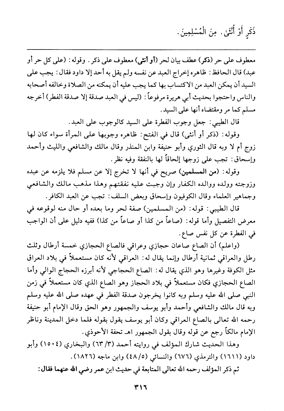 قال الطيبي: قوله: (من المسلمين) صفة لحر وما بعده أو حال منه لوقوعه في معرض التفصيل وأما قوله: (صاعًا من كذا أو صاعًا من كذا) ففيه دليل على أن الواجب في الفطرة عن كل نفس صاع.