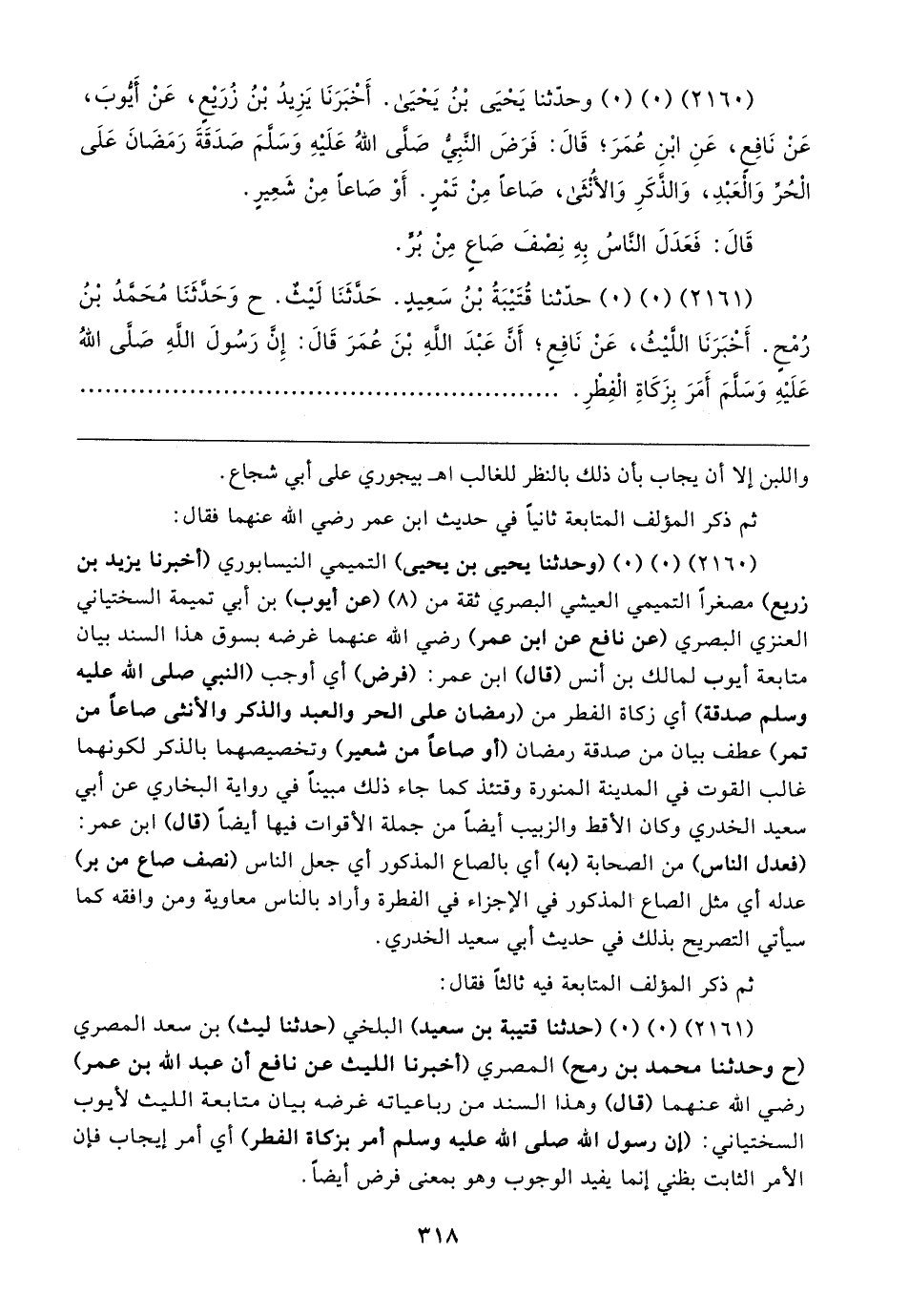 (٢١٦١) (٠) (٠) حدَّثنا قُتَيبَةُ بْنُ سَعِيدٍ. حَدَّثَنَا لَيثٌ. ح وَحَدَّثَنَا مُحَمَّدُ بْنُ رُمْحٍ. أَخْبَرَنَا اللَّيثُ، عَنْ نَافِعٍ؛ أَنَّ عَبْدَ اللهِ بْنَ عُمَرَ قَال: إِنَّ رَسُولَ اللهِ صَلَّى اللهُ عَلَيهِ وَسَلَّمَ أَمَرَ بِزَكَاةِ الْفِطْرِ