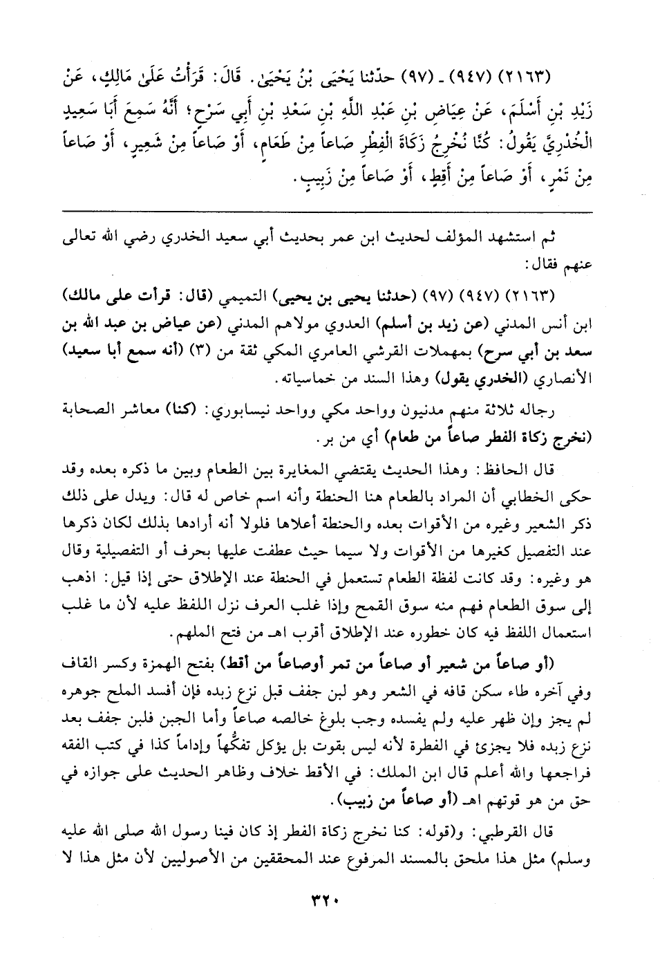 (٢١٦٣) (٩٤٧) - (٩٧) حدَّثنا يَحْيَى بْنُ يَحْيَى. قَال: قَرَأتُ عَلَى مَالِكٍ، عَنْ زَيدِ بْنِ أَسْلَمَ، عَنْ عِيَاضِ بْنِ عَبْدِ اللهِ بْنِ سَعْدِ بْنِ أَبِي سَرْحٍ؛ أَنَّهُ سَمِعَ أَبَا سَعِيدٍ الْخُدْرِيَّ يَقُولُ: كُنَّا نُخْرِجُ زَكَاةَ الْفِطْرِ صَاعًا مِنْ طَعَامٍ، أَوْ صَاعًا مِنْ شَعِيرٍ، أَوْ صَاعًا مِنْ تَمْرٍ، أَوْ صَاعًا مِنْ أَقِطٍ، أَوْ صَاعًا مِنْ زَبِيبٍ