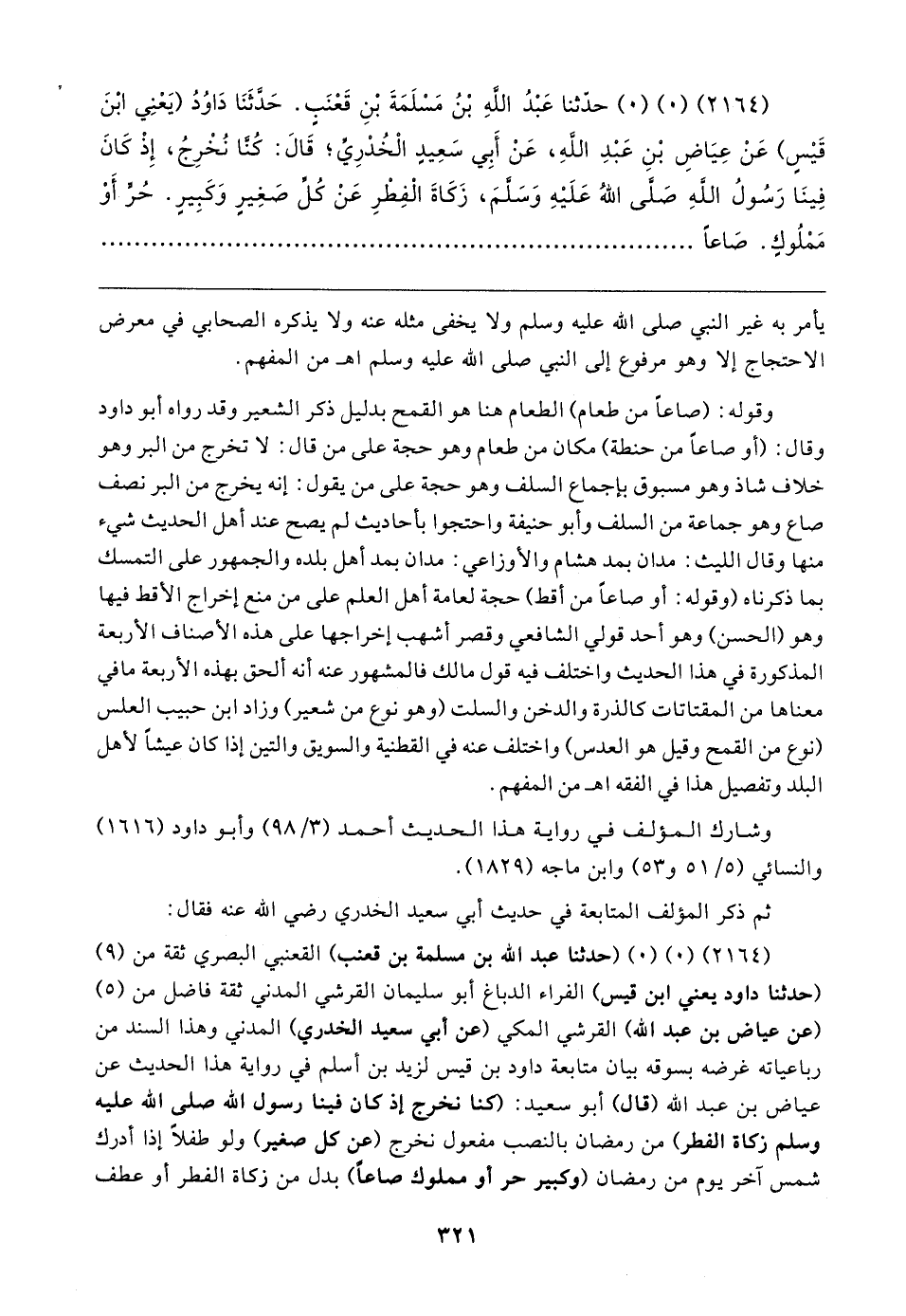 (٢١٦٤) (٠) (٠) (حدثنا عبد الله بن مسلمة بن قعنب) القعنبي البصري ثقة من (٩) (حدثنا داود يعني ابن قيس) الفراء الدباغ أبو سليمان القرشي المدني ثقة فاضل من (٥) (عن عياض بن عبد الله) القرشي المكي (عن أبي سعيد الخدري) المدني وهذا السند من رباعياته غرضه بسوقه بيان متابعة داود بن قيس لزيد بن أسلم في رواية هذا الحديث عن عياض بن عبد الله (قال) أبو سعيد: (كنا نخرج إذ كان فينا رسول الله صلى الله عليه وسلم زكاة الفطر) من رمضان بالنصب مفعول نخرج (عن كل صغير) ولو طفلًا إذا أدرك شمس آخر يوم من رمضان (وكبير حر أو مملوك صاعًا) بدل من زكاة الفطر أو عطف