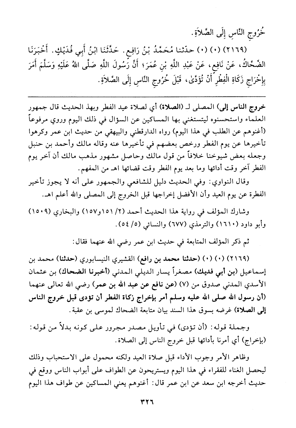 (٢١٦٩) (٠) (٠) حدَّثنا مُحَمَّدُ بْنُ رَافِعٍ. حَدَّثَنَا ابْنُ أَبِي فُدَيكٍ. أَخْبَرَنَا الضَّحَّاكُ، عَنْ نَافِعٍ، عَنْ عَبْدِ اللهِ بْنِ عُمَرَ؛ أَنَّ رَسُولَ اللهِ صَلى اللهُ عَلَيهِ وَسَلَّمَ أَمَرَ بِإِخْرَاجِ زَكَاةِ الْفطْرِ أَنْ تُؤَدَّى، قَبْلَ خُرُوجِ النَّاسِ إِلَى الصَّلاةِ