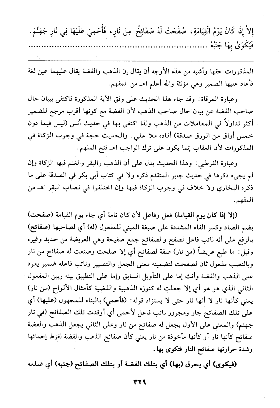 (إلا إذا كان يوم القيامة) فعل وفاعل لأن كان تامة أي جاء يوم القيامة (صفحت) بضم الصاد وكسر الفاء المشددة على صيغة المبني للمفعول (له) أي لصاحبها (صفائح) بالرفع على أنه نائب فاعل لصفح والصفائح جمع صفيحة وهي العريضة من حديد وغيره وقيل: ما طبع عريضًا (من نار) صفة لصفائح أي إلا صلحت وصنعت له صفائح من نار وبالنصب مفعول ثان لصفحت لتضمينه معنى الجعل والتصيير ونائب فاعله ضمير يعود على الذهب والفضة وأنث إما على التأويل السابق وإما على التطبيق بينه وبين المفعول الثاني الذي هو هو أي إلا جعلت له كنوزه الذهبية والفضية كامثال الألواح (من نار) يعني كأنها نار لا أنها نار حتى لا يستزاد قوله: (فأحمي) بالبناء للمجهول (عليها) أي على تلك الصفائح جار ومجرور نائب فاعل لأحمى أي أوقدت تلك الصفائح (في نار جهنم) والمعنى على الأول يجعل له صفائح من نار وعلى الثاني يجعل الذهب والفضة صفائح كأنها نار أو كأنها مأخوذة من نار يعني كان صفائح الذهب والفضة لفرط إحمائها وشدة حرارتها صفائح النار فتكوى بها.