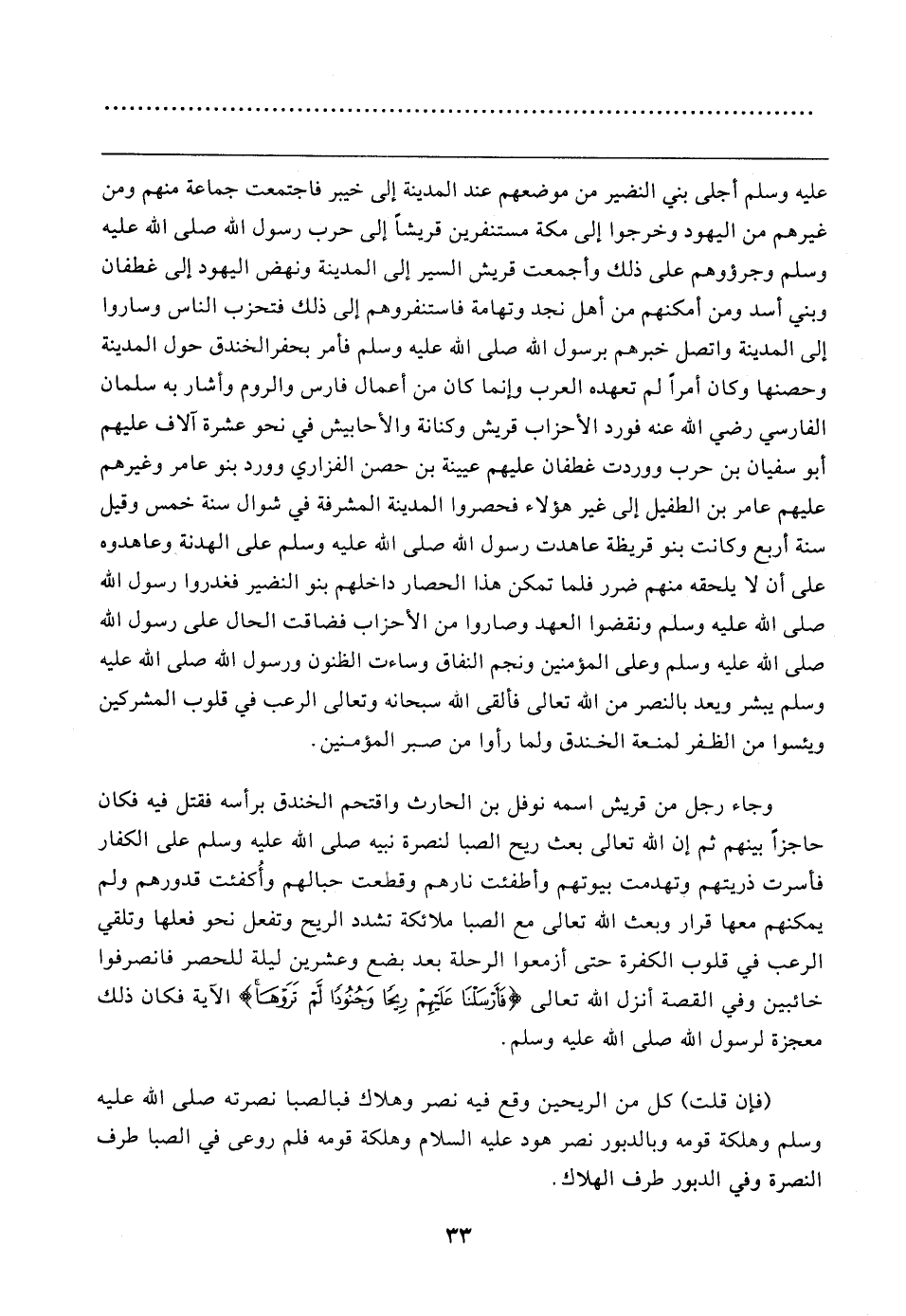 وجاء رجل من قريش اسمه نوفل بن الحارث واقتحم الخندق برأسه فقتل فيه فكان حاجزًا بينهم ثم إن الله تعالى بعث ريح الصبا لنصرة نبيه صلى الله عليه وسلم على الكفار فأسرت ذريتهم وتهدمت بيوتهم وأطفئت نارهم وقطعت حبالهم وأُكفئت قدورهم ولم يمكنهم معها قرار وبعث الله تعالى مع الصبا ملائكة تشدد الريح وتفعل نحو فعلها وتلقي الرعب في قلوب الكفرة حتى أزمعوا الرحلة بعد بضع وعشرين ليلة للحصر فانصرفوا خائبين وفي القصة أنزل الله تعالى {فَأَرْسَلْنَا عَلَيهِمْ رِيحًا وَجُنُودًا لَمْ تَرَوْهَا} الآية فكان ذلك معجزة لرسول الله صلى الله عليه وسلم.