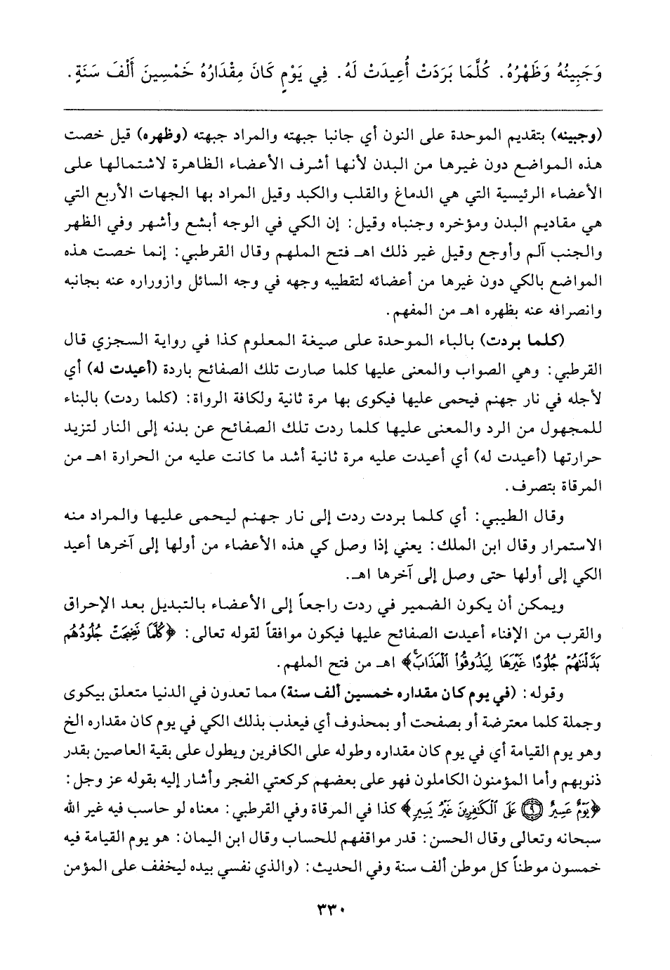 وَجَبِينُهُ وَظَهْرُهُ. كُلَّمَا بَرَدَتْ أُعِيدَتْ لَهُ. فِي يَوْمٍ كَانَ مِقْدَارُهُ خَمْسِينَ أَلْفَ سَنَةٍ