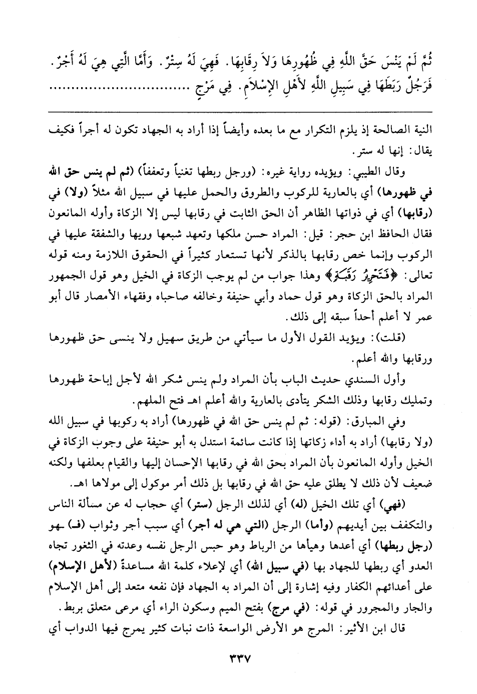 ثُمَّ لَمْ يَنْسَ حَقَّ اللهِ فِي ظُهُورِهَا وَلَا رِقَابِهَا. فَهِيَ لَهُ سِتْرٌ. وَأَمَّا الَّتِي هِيَ لَهُ أَجْرٌ. فَرَجُلٌ رَبَطَهَا فِي سَبِيلِ اللهِ لأَهْلِ الإِسْلامِ. فِي مَرْجٍ