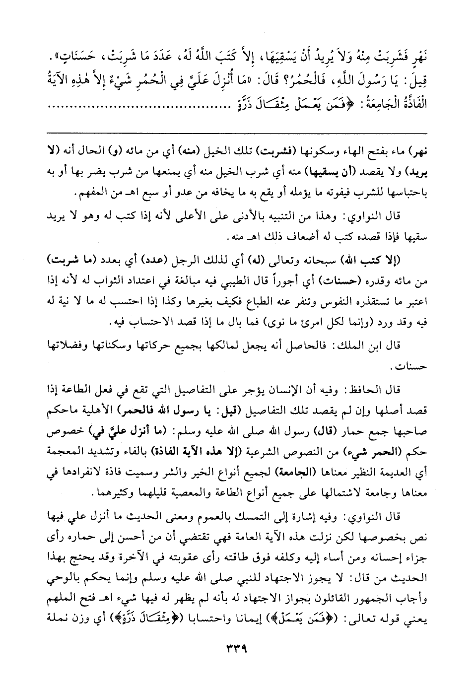 نَهْرٍ فَشَرِبَتْ مِنْهُ وَلَا يُرِيدُ أَنْ يَسْقِيَهَا، إلا كَتَبَ اللهُ لَهُ، عَدَدَ مَا شَرِبَتْ، حَسَنَاتٍ". قِيلَ: يَا رَسُولَ اللهِ، فَالْحُمُرُ؟ قَال: "مَا أُنْزِلَ عَلَيَّ فِي الْحُمُرِ شَيءٌ إلا هذِهِ الآيَةُ الْفَاذَّةُ الْجَامِعَةُ: {فَمَنْ يَعْمَلْ مِثْقَال ذَرَّةٍ