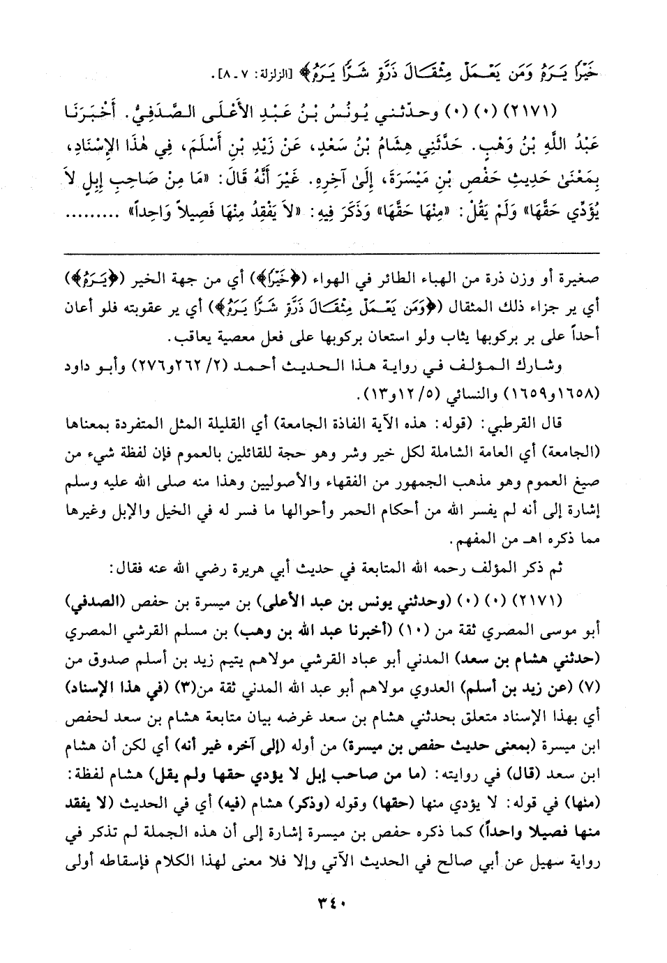 (٢١٧١) (٠) (٠) وحدَّثني يُونُسُ بْنُ عَبْدِ الأعلَى الصَّدَفِيُّ. أَخبَرَنَا عَبْدُ اللهِ بْنُ وَهْبٍ. حَدَّثَنِي هِشَامُ بْنُ سَعْدٍ، عَنْ زَيدِ بْنِ أَسْلَمَ، فِي هذَا الإِسْنَادِ، بِمَعْنَى حَدِيثِ حَفْصِ بْنِ مَيسَرَةَ، إِلَى آخِرِهِ. غَيرَ أَنَّهُ قَال: "مَا مِنْ صَاحِبِ إِبِلٍ لَا يُؤَدِّي حَقَّهَا" وَلَمْ يَقُلْ: "مِنْهَا حَقَّهَا" وَذَكَرَ فِيهِ: "لَا يَفْقِدُ مِنْهَا فَصِيلًا وَاحِدًا"