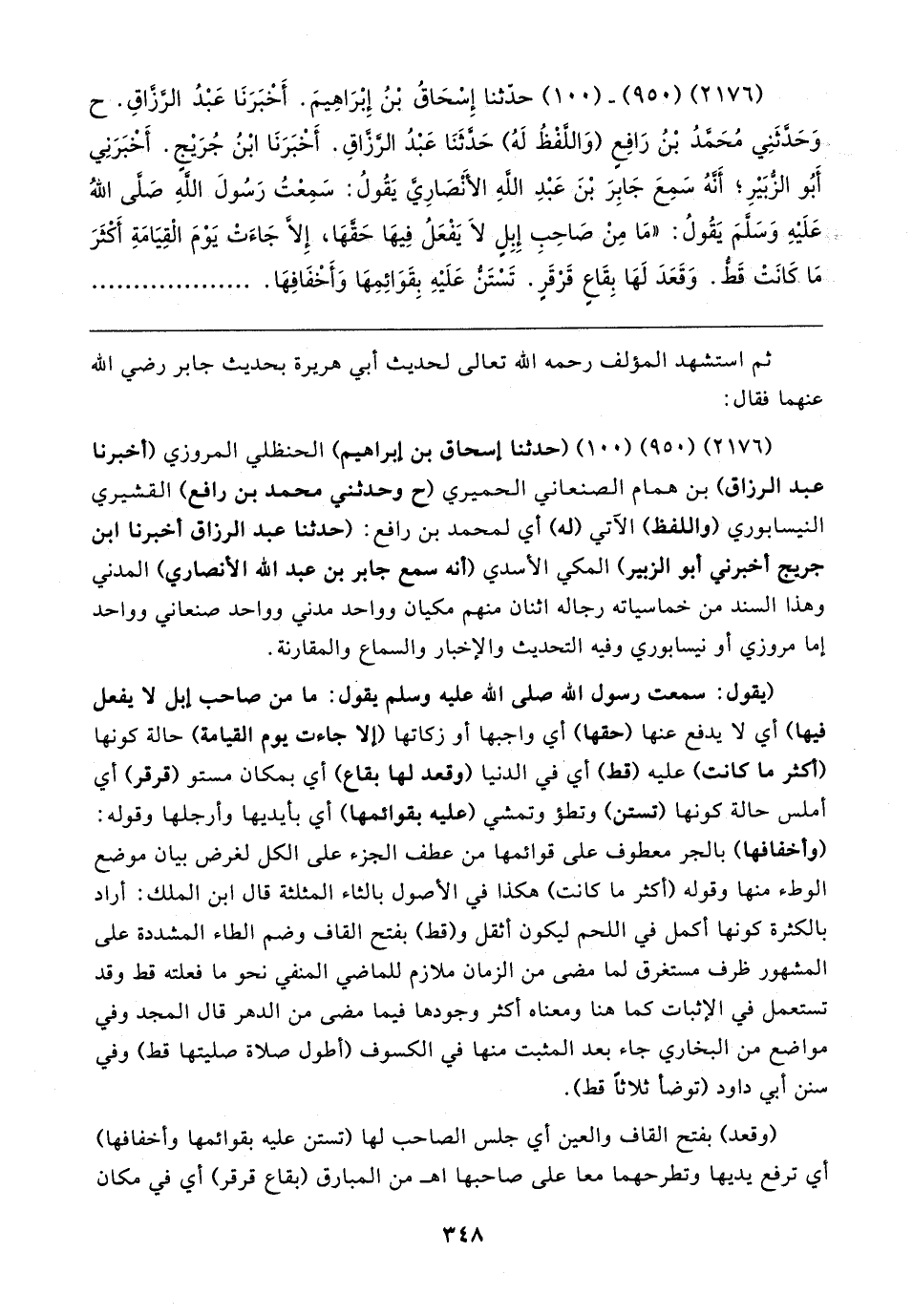 (٢١٧٦) (٩٥٠) - (١٠٠) حدَّثنا إِسْحَاقُ بْنُ إِبْرَاهِيمَ. أَخْبَرَنَا عَبْدُ الرَّزَّاقِ. ح وَحَدَّثَنِي مُحَمَّدُ بْنُ رَافِعٍ (وَاللَّفْظُ لَهُ) حَدَّثَنَا عَبْدُ الرَّزَّاقِ. أَخْبَرَنَا ابْنُ جُرَيجٍ. أَخْبَرَنِي أَبُو الزُّبَيرِ؛ أَنَّهُ سَمِعَ جَابِرَ بْنَ عَبْدِ اللهِ الأَنْصَارِيَّ يَقُولُ: سَمِعْتُ رَسُولَ اللهِ صَلَّى اللهُ عَلَيهِ وَسَلَّمَ يَقُولُ: "مَا مِنْ صَاحِبِ إِبِلٍ لَا يَفْعَلُ فِيهَا حَقَّهَا، إلا جَاءَتْ يَوْمَ الْقِيَامَةِ أَكْثَرَ مَا كَانَتْ قَطُّ. وَقَعَدَ لَهَا بِقَاعٍ قَرْقَرٍ. تَسْتَنُّ عَلَيهِ بِقَوَائِمِهَا وَأَخْفَافِهَا