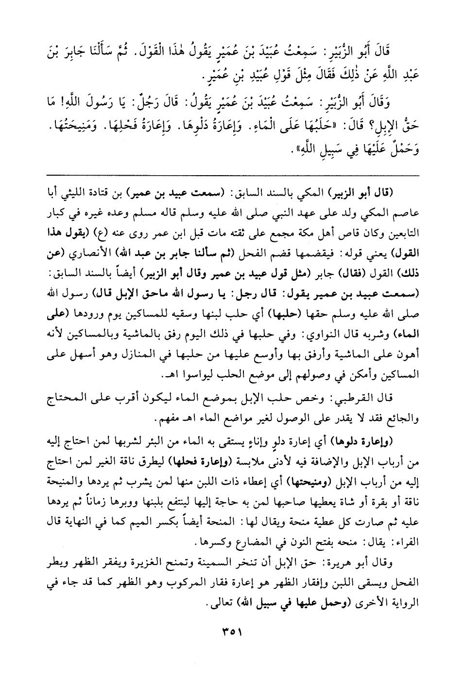 وَقَال أَبُو الزُّبَيرِ: سَمِعْتُ عُبَيدَ بْنَ عُمَيرٍ يَقُولُ: قَال رَجُلٌ: يَا رَسُولَ اللهِ! مَا حَقُّ الإِبِلِ؟ قَال: "حَلَبُهَا عَلَى الْمَاءِ. وَإعَارَةُ دَلْوهَا. وَإِعَارَةُ فَحْلِهَا. وَمَنِيحَتُهَا. وَحَمْلٌ عَلَيهَا فِي سَبِيلِ اللهِ"