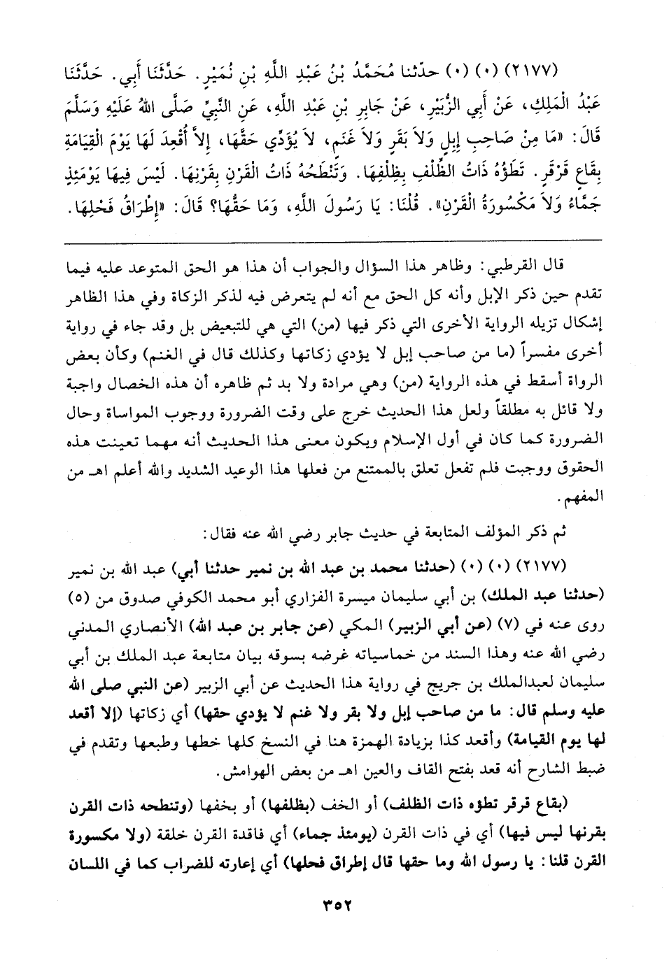 (٢١٧٧) (٠) (٠) حدَّثنا مُحَمَّدُ بْنُ عَبْدِ اللهِ بْنِ نُمَيرٍ. حَدَّثَنَا أَبِي. حَدَّثَنَا عَبْدُ الْمَلِكِ، عَنْ أَبِي الزُّبَيرِ، عَنْ جَابِرِ بْنِ عَبْدِ اللهِ، عَنِ النَّبِي صَلَّى اللهُ عَلَيهِ وَسَلَّمَ قَال: "مَا مِنْ صَاحِبِ إِبِلٍ وَلَا بَقَرٍ وَلَا غَنَمٍ، لَا يُؤَدِّي حَقَّهَا، إلا أُقْعِدَ لَهَا يَوْمَ الْقِيَامَةِ بِقَاعٍ قَرْقَرٍ. تَطَؤُهُ ذَاتُ الظِّلْفِ بِظِلْفِهَا. وَتَنْطَحُهُ ذَاتُ الْقَرْنِ بِقَرْنِهَا. لَيسَ فِيهَا يَؤمَئِذٍ جَمَّاءُ وَلَا مَكْسُورَةُ الْقَرْنِ". قُلْنَا: يَا رَسُولَ اللهِ، وَمَا حَقُّهَا؟ قَال: "إِطْرَاقُ فَحْلِهَا