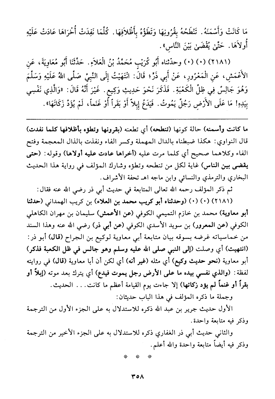 (٢١٨١) (٠) (٠) (وحدثناه أبو كريب محمد بن العلاء) بن كريب الهمداني (حدثنا أبو معاوية) محمد بن خازم التميمي الكوفي (عن الأعمش) سليمان بن مهران الكاهلي الكوفي (عن المعرور) بن سويد الأسدي الكوفي (عن أبي ذر) رضي الله عنه وهذا السند من خماسياته غرضه بسوقه بيان متابعة أبي معاوية لوكيع بن الجراح (قال) أبو ذر: (انتهيت) أي وصلت (إلى النبي صلى الله عليه وسلم وهو جالس في ظل الكعبة فذكر) أبو معاوية (نحو حديث وكيع) أي مثله (غير أنه) أي لكن أن أبا معاوية (قال) في روايته لفظة: (والذي نفسي بيده ما على الأرض رجل يموت فيدع) أي يترك بعد موته (إبلًا أو بقرًا أو غنمًا لم يؤد زكاتها) إلا جاءت يوم القيامة أعظم ما كانت ... الحديث.