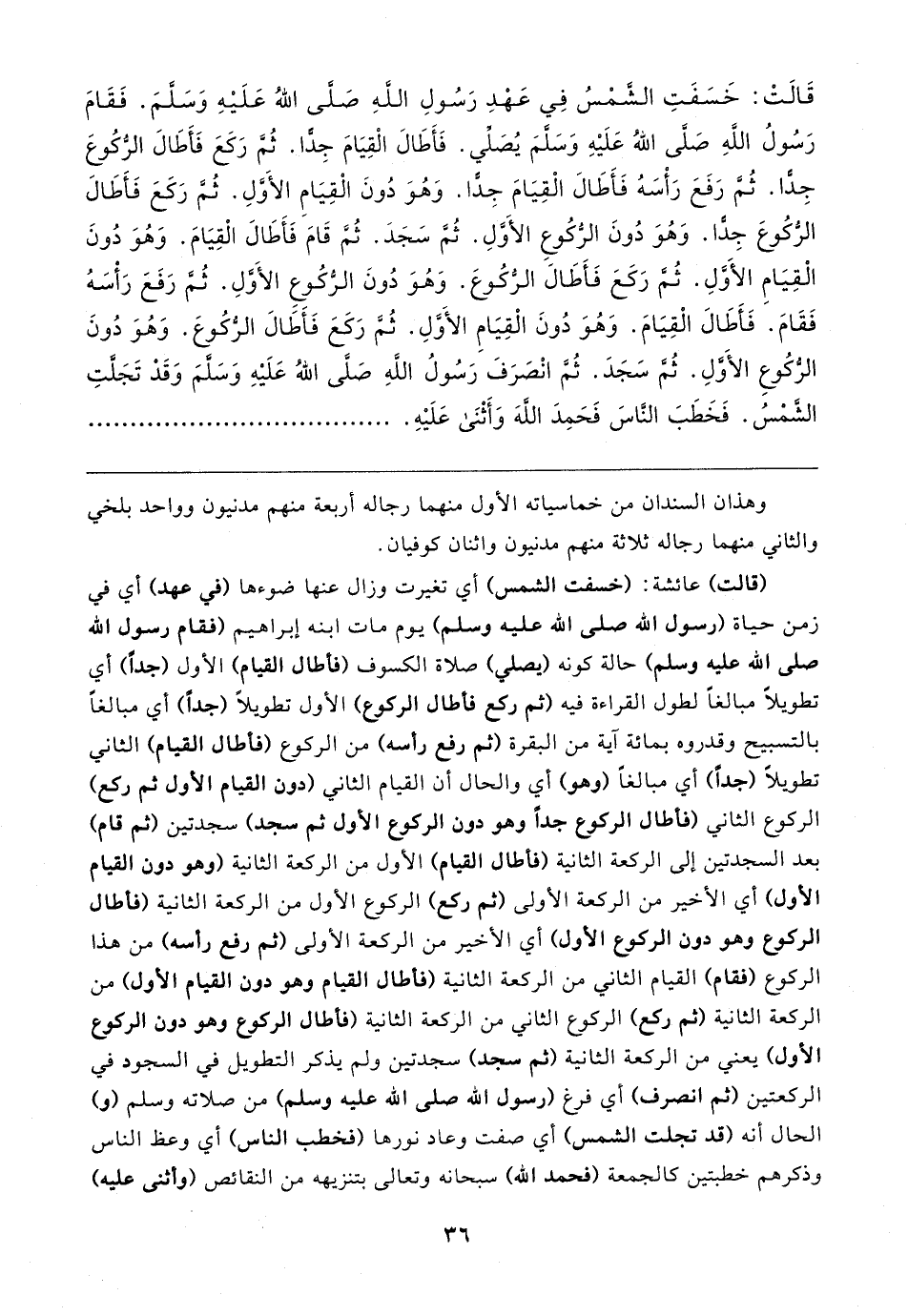 قَالتْ: خَسَفَتِ الشَّمْسُ فِي عَهْدِ رَسُولِ اللَّهِ صلى الله عليه وسلم. فَقَامَ رَسُولُ اللَّهِ صلى الله عليه وسلم يُصَلِّي. فَأَطَال الْقِيَامَ جِدًّا. ثُمَّ رَكَعَ فَأَطَال الرُّكُوعَ جِدًّا. ثُمَّ رَفَعَ رَأْسَهُ فَأَطَال الْقِيَامَ جِدًّا. وَهُوَ دُونَ الْقِيَامِ الأَوَّلِ. ثُمَّ رَكَعَ فَأَطَال الرُّكُوعَ جِدًّا. وَهُوَ دُونَ الرُّكُوعِ الأَوَّلِ. ثُمَّ سَجَدَ. ثُمَّ قَامَ فَأَطَال الْقِيَامَ. وَهُوَ دُونَ الْقِيَامِ الأَوَّلِ. ثُمَّ رَكَعَ فَأَطَال الرُّكُوعَ. وَهُوَ دُونَ الرُّكُوعِ الأَوَّلِ. ثُمَّ رَفَعَ رَأْسَهُ فَقَامَ. فَأَطَال الْقِيَامَ. وَهُوَ دُونَ الْقِيَامِ الأَوَّلِ. ثُمَّ رَكَعَ فَأَطَال الرُّكُوعَ. وَهُوَ دُونَ الرُّكُوعِ الأَوَّلِ. ثُمَّ سَجَدَ. ثُمَّ انْصَرَفَ رَسُولُ اللَّهِ صلى الله عليه وسلم وَقَدْ تَجَلَّتِ الشَّمْسُ. فَخَطَبَ النَّاسَ فَحَمِدَ اللَّهَ وَأَثْنَى عَلَيهِ