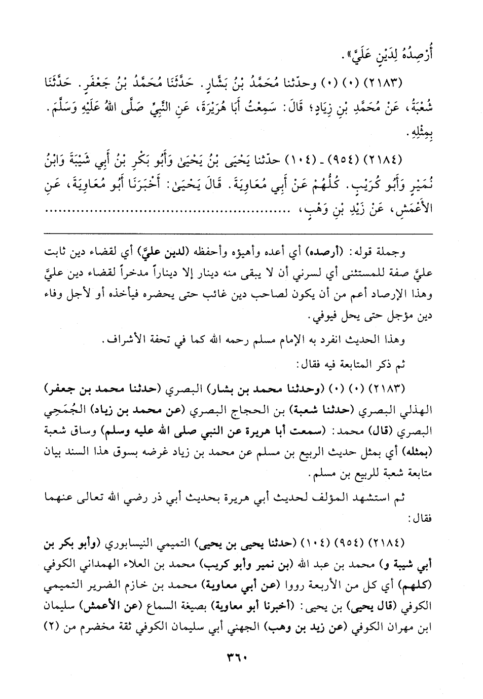 (٢١٨٣) (٠) (٠) (وحدثنا محمد بن بشار) البصري (حدثنا محمد بن جعفر) الهذلي البصري (حدثنا شعبة) بن الحجاج البصري (عن محمد بن زياد) الجُمَحِي البصري (قال) محمد: (سمعت أبا هريرة عن النبي صلى الله عليه وسلم) وساق شعبة (بمثله) أي بمثل حديث الربيع بن مسلم عن محمد بن زياد غرضه بسوق هذا السند بيان متابعة شعبة للربيع بن مسلم.