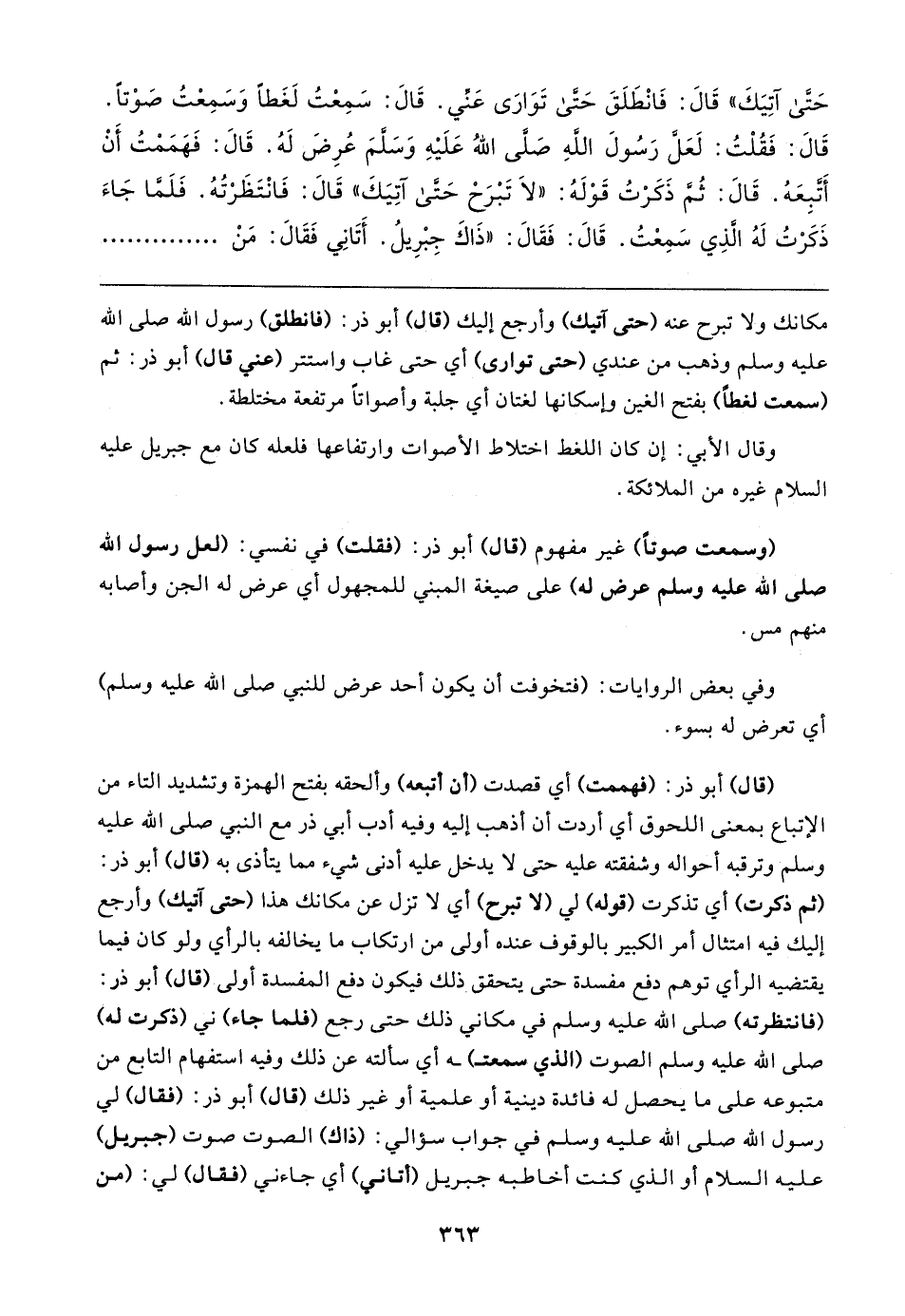 حَتَّى آتِيَكَ" قَال: فَانْطَلَقَ حَتَّى تَوَارَى عَنِّي. قَال: سَمِعْتُ لَغَطًا وَسَمِعْتُ صَوْتًا. قَال: فَقُلْتُ: لَعَل رَسُولَ اللهِ صَلَّى اللهُ عَلَيهِ وَسَلَّمَ عُرِضَ لَهُ. قَال: فَهَمَمْتُ أَنْ أَتَّبِعَهُ. قَال: ثُمَّ ذَكَرْتُ قَوْلَهُ: "لَا تَبْرَحْ حَتَّى آتِيَكَ" قَال: فَانْتَظَرْتُهُ. فَلَمَّا جَاءَ ذَكَرْتُ لَهُ الَّذِي سَمِعْتُ. قَال: فَقَال: "ذَاكَ جِبْرِيلُ. أَتَانِي فَقَال: مَنْ