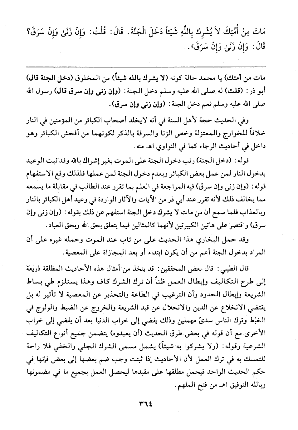 مَاتَ مِنْ أُمَّتِكَ لَا يُشْرِك بِاللهِ شَيئًا دَخَلَ الْجَنَّةَ. قَال: قُلْتُ: وَإِنْ زَنَى وَإِنْ سَرَقَ؟ قَال: وَإِنْ زَنَى وَإِنْ سَرَقَ"