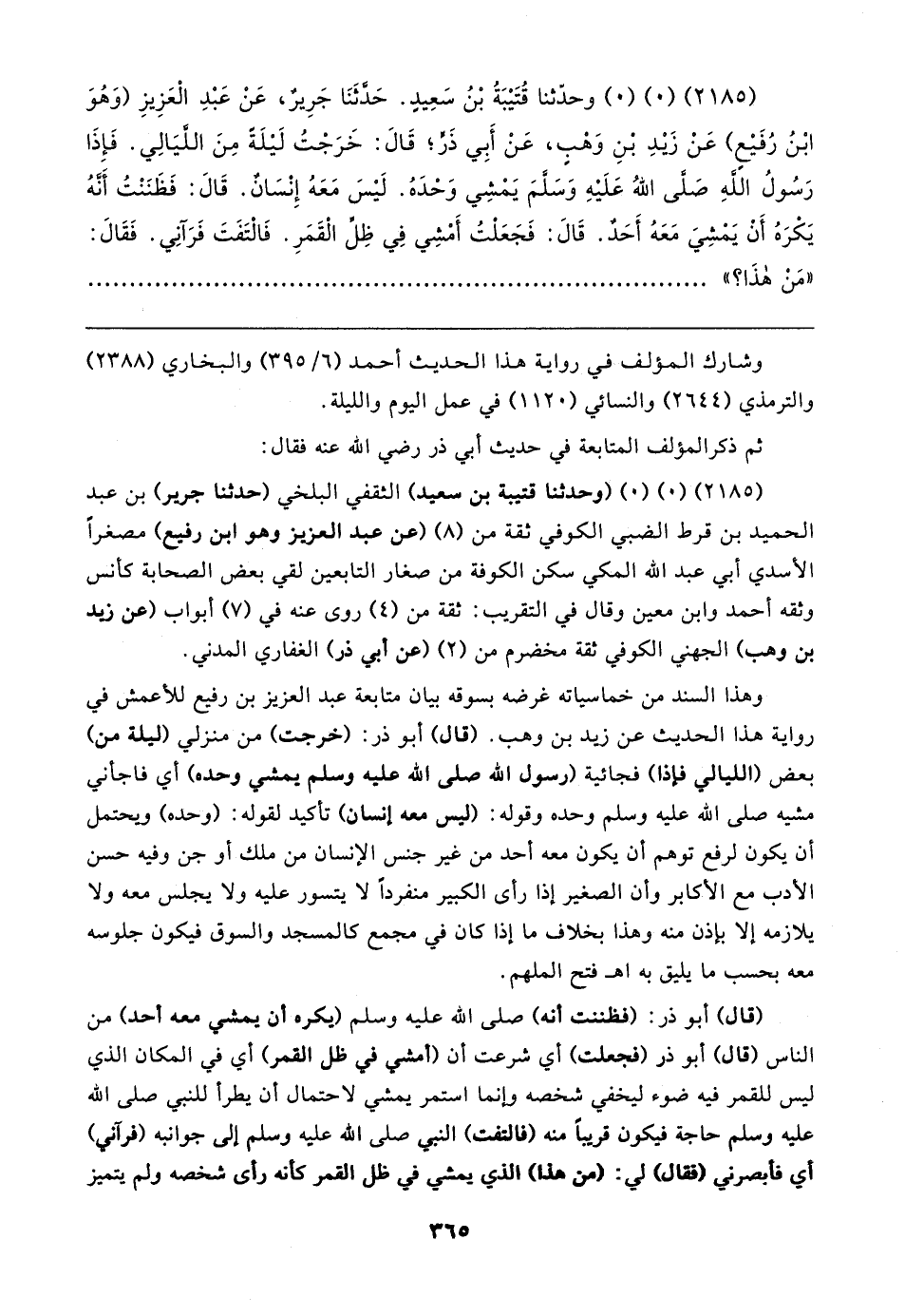 (٢١٨٥) (٠) (٠) وحدّثنا قُتَيبَةُ بْنُ سَعِيدٍ. حَدَّثَنَا جَرِيرٌ، عَنْ عَبْدِ الْعَزِيزِ (وَهُوَ ابْنُ رُفَيعٍ) عَنْ زَيدِ بنِ وَهْبٍ، عَنْ أَبِي ذَرٍّ؛ قَال: خَرَجْتُ لَيلَةً مِنَ اللَّيَالِي. فَإِذَا رَسُولُ - صلى الله عليه وسلم - يَمْشِي وَحْدَهُ. لَيسَ مَعَهُ إِنْسَانٌ. قَال: فَظَنَنْتُ أَنَّهُ يَكْرَهُ أَنْ يَمْشِيَ مَعَهُ أَحَدٌ. قَال: فَجَعَلْتُ أَمْشِي فِي ظِلِّ الْقَمَرِ. فَالْتَفَتَ فَرآنِي. فَقَال: "مَنْ هذَا؟ "