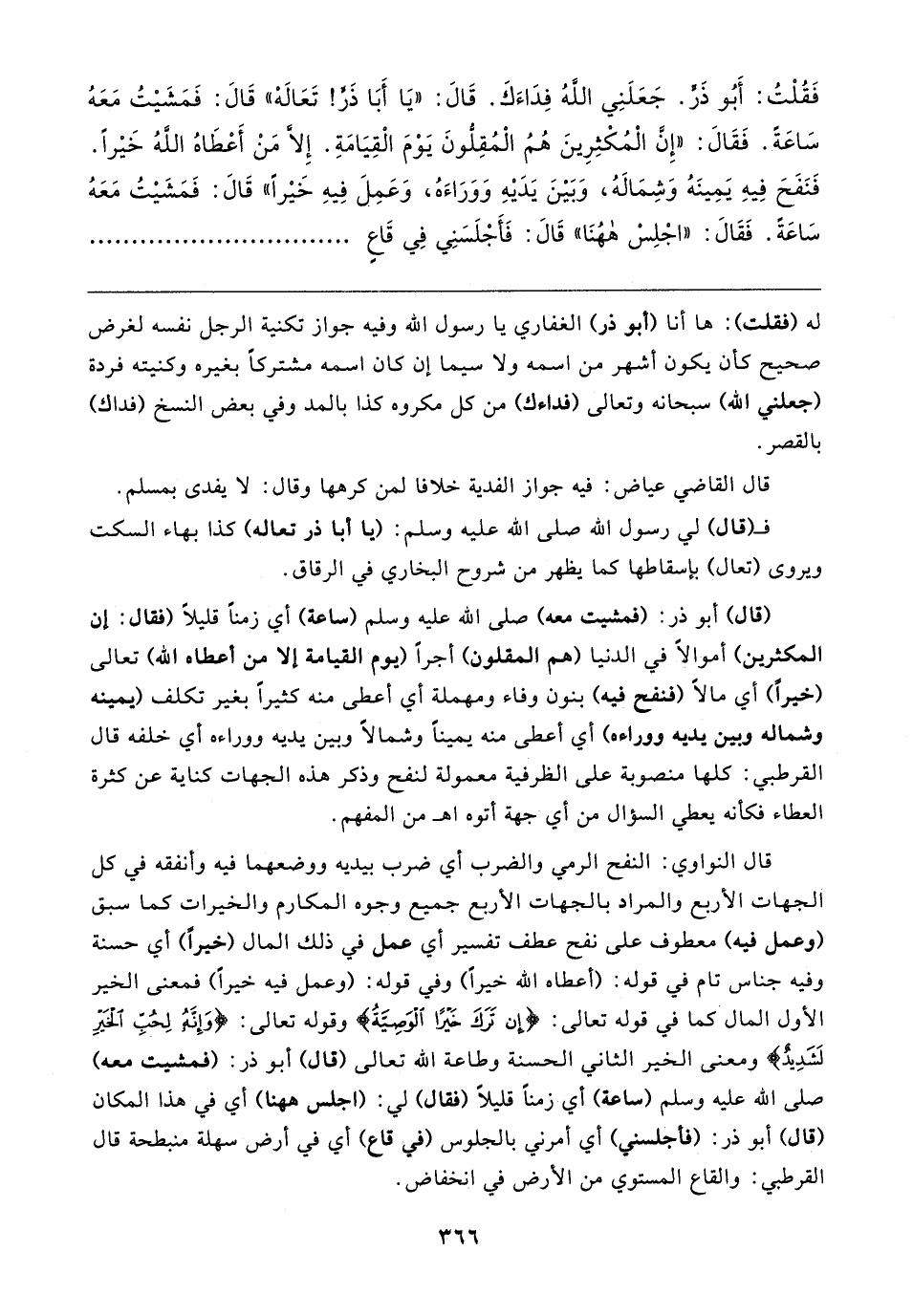 فَقُلْتُ: أَبُو ذَرٍّ. جَعَلَنِي اللهُ فِدَاءَكَ. قَال: "يَا أَبَا ذَرٍّ! تَعَالهْ" قَال: فَمَشَيتُ مَعَهُ سَاعَةً. فَقَال: "إِنَّ الْمُكْثِرِينَ هُمُ الْمُقِلُّونَ يَوْمَ الْقِيَامَةِ. إِلَّا مَنْ أَعْطَاهُ اللهُ خَيرًا. فَنَفَحَ فِيهِ يَمِينَهُ وَشِمَالهُ، وَبَينَ يَدَيهِ وَوَرَاءَهُ، وَعَمِلَ فِيهِ خَيرًا" قَال: فَمَشَيتُ مَعَهُ سَاعَةً. فَقَال: "اجْلِسْ ههُنَا" قَال: فَأَجْلَسَنِي فِي قَاعٍ