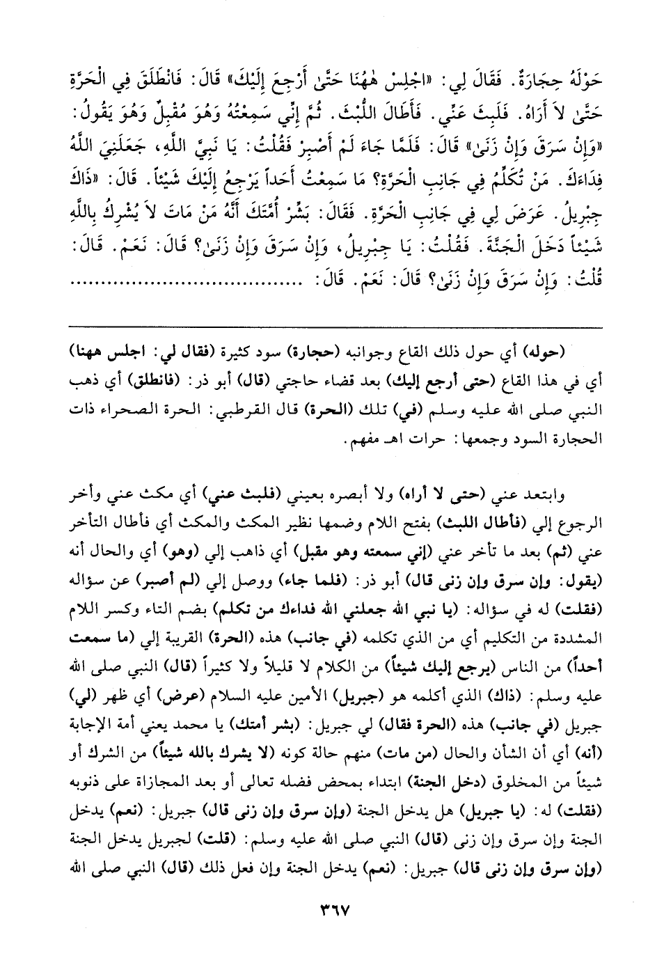 حَوْلَهُ حِجَارَةٌ. فَقَال لِي: "اجْلِسْ ههُنَا حَتَّى أَرْجِعَ إِلَيكَ" قَال: فَانْطَلَقَ فِي الْحَرَّةِ حَتَّى لَا أَرَاهُ. فَلَبِثَ عَنِّي. فَأَطَال اللُّبْثَ. ثُمَّ إِنِّي سَمِعْتُهُ وَهُوَ مُقْبِلٌ وَهُوَ يَقُولُ: "وَإِنْ سَرَقَ وَإِنْ زَنَى" قَال: فَلَمَّا جَاءَ لَمْ أَصْبِرْ فَقُلْتُ: يَا نَبِيَّ اللهِ، جَعَلَنِيَ اللهُ فِدَاءَكَ. مَنْ تُكَلِّمُ فِي جَانِبِ الْحَرَّةِ؟ مَا سَمِعْتُ أَحَدًا يَرْجِعُ إِلَيكَ شَيئًا. قَال: "ذَاكَ جِبْرِيلُ. عَرَضَ لِي فِي جَانِبِ الْحَرَّةِ. فَقَال: بَشَّرْ أُمَّتَكَ أَنَّهُ مَنْ مَاتَ لَا يُشْرِكُ بِاللهِ شَيئًا دَخَلَ الْجَنَّةَ. فَقُلْتُ: يَا جِبْرِيلُ، وَإِنْ سَرَقَ وَإِنْ زَنَى؟ قَال: نَعَمْ. قَال: قُلْتُ: وَإِنْ سَرَقَ وَإِنْ زَنَى؟ قَال: نَعَمْ. قَال: