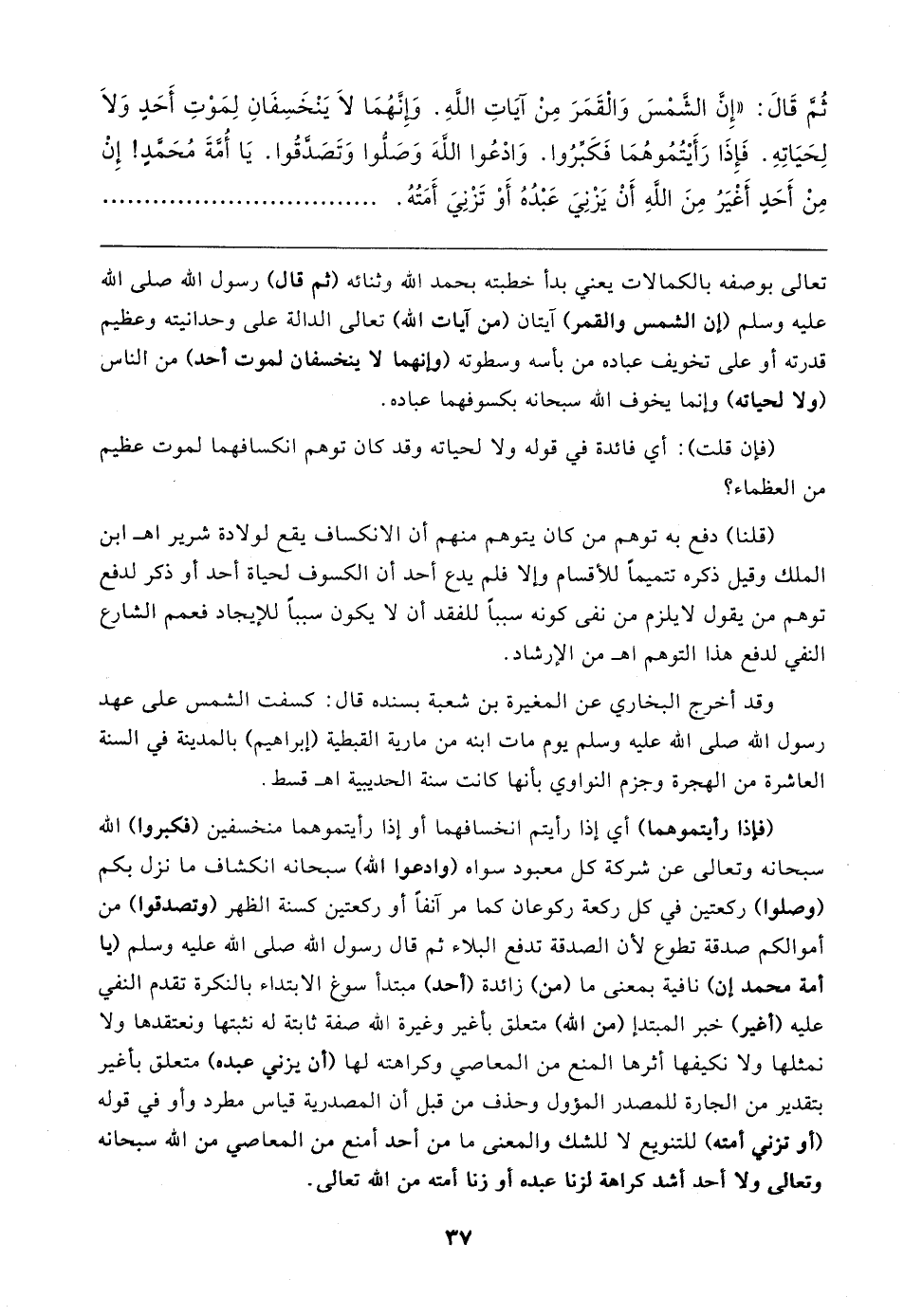 ثُمَّ قَال: "إِنَّ الشَّمْسَ وَالْقَمَرَ مِنْ آيَاتِ اللَّهِ. وَإِنَّهُمَا لَا يَنْخَسِفَانِ لِمَوْتِ أَحَدٍ وَلَا لِحَيَاتِهِ. فَإِذَا رَأَيتُمُوهُمَا فَكَبِّرُوا. وَادْعُوا اللَّهَ وَصَلُّوا وَتَصَدَّقُوا. يَا أُمَّةَ مُحَمَّدٍ! إِنْ مِنْ أَحَدٍ أَغْيَرَ مِنَ اللَّهِ أَنْ يَزْنِيَ عَبْدُهُ أَوْ تَزْنِيَ أَمَتُهُ