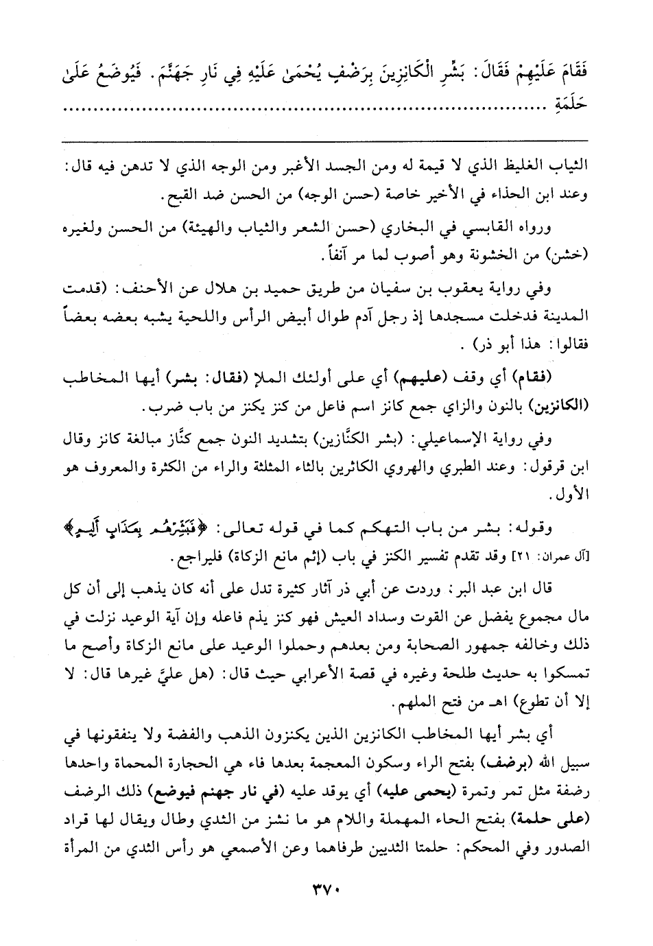 (فقام) أي وقف (عليهم) أي على أولئك الملإ (فقال: بشر) أيها المخاطب (الكانزين) بالنون والزاي جمع كانز اسم فاعل من كنز يكنز من باب ضرب.