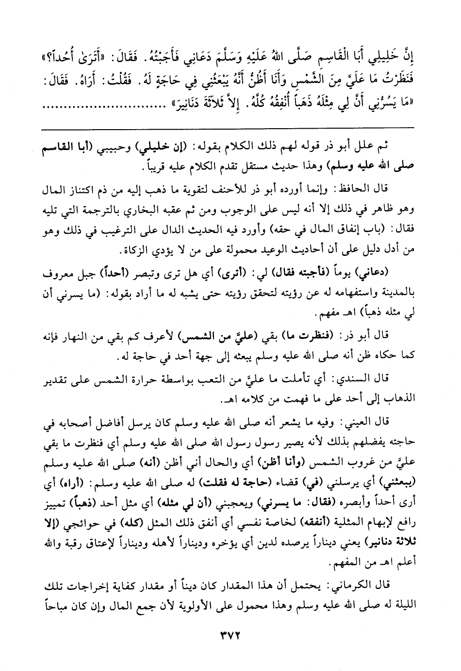 إِنَّ خَلِيلِي أَبَا الْقَاسِمِ - صلى الله عليه وسلم - دَعَانِي فَأَجَبْتُهُ. فَقَال: "أَتَرَى أُحُدًا؟ " فَنَظَرْتُ مَا عَلَيَّ مِنَ الشَّمْسِ وَأَنَا أَظُنُّ أَنَّهُ يَبْعَثُنِي فِي حَاجَةٍ لَهُ. فَقُلْتُ: أَرَاهُ. فَقَال: "مَا يَسُرُّنِي أَنَّ لِي مِثْلَهُ ذَهَبًا أُنْفِقُهُ كُلَّهُ. إِلَّا ثَلاثَةَ دَنَانِيرَ"