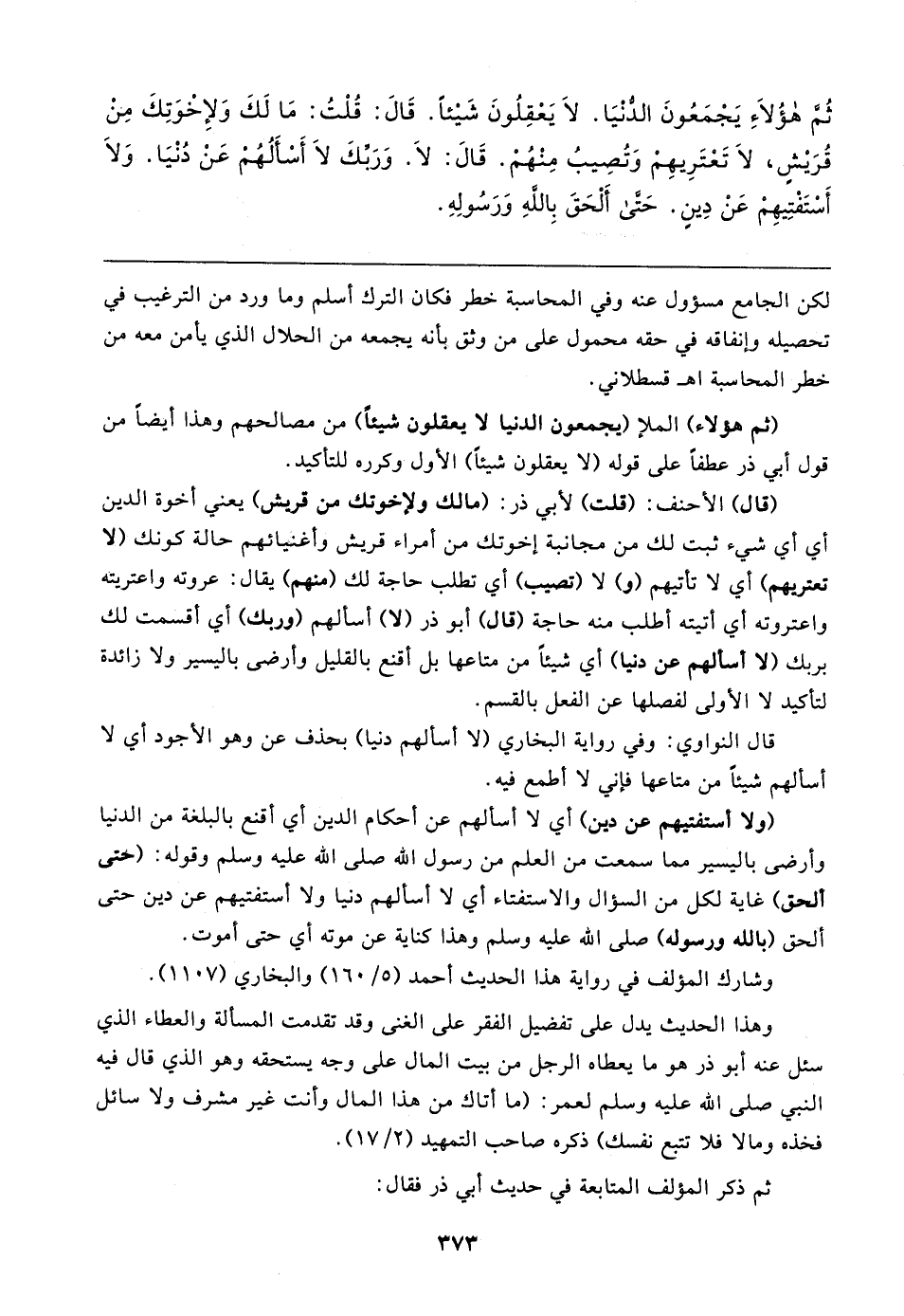 ثُمَّ هؤُلاءِ يَجْمَعُونَ الدُّنْيَا. لَا يَعْقِلُونَ شَيئًا. قَال: قُلْتُ: مَا لَكَ وَلإِخْوَتِكَ مِنْ قُرَيشٍ، لَا تَعْتَرِيهِمْ وَتُصِيبُ مِنْهُمْ. قَال: لَا. وَرَبِّكَ لَا أَسْالُهُمْ عَنْ دُنْيَا. وَلَا أَسْتَفْتِيهِمْ عَنْ دِينٍ. حَتَّى أَلْحَقَ بِاللهِ وَرَسُولِهِ