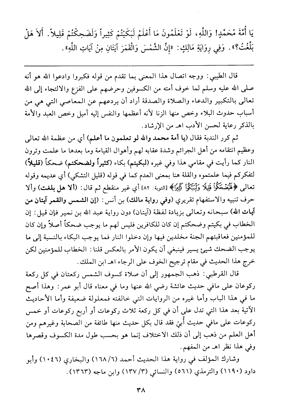 يَا أُمَّةَ مُحَمَّدٍ! وَاللَّهِ, لَوْ تَعْلَمُونَ مَا أَعْلَمُ لَبَكَيتُمْ كَثِيرًا وَلَضَحِكْتُمْ قَلِيلًا. أَلا هَلْ بَلَّغْتُ؟ ". وَفِي رِوَايَةِ مَالِكٍ: إِنَّ الشَّمْسَ وَالْقَمَرَ آيَتَانِ مِنْ آيَاتِ اللَّهِ"