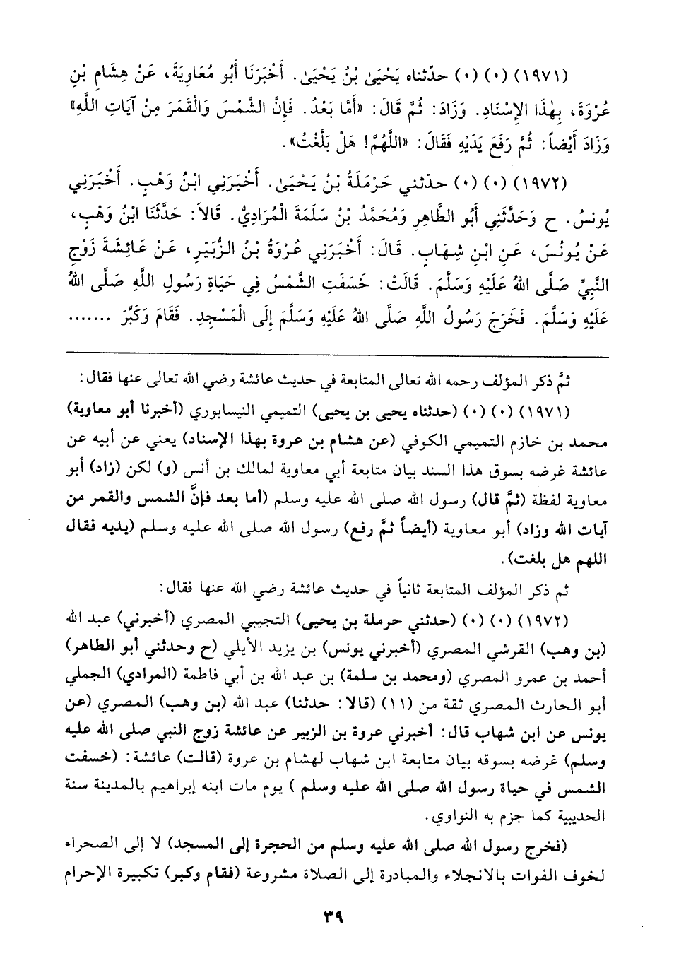 (١٩٧٢) (٠) (٠) حَدَّثَنِي حَرْمَلَةُ بْنُ يَحْيَى. أَخْبَرَنِي ابْنُ وَهْبٍ. أَخْبَرَنِي يُونُسُ. ح وَحَدَّثَنِي أَبُو الطَّاهِرِ وَمُحَمَّدُ بْنُ سَلَمَةَ الْمُرَادِيُّ. قَالا: حَدَّثَنَا ابْنُ وَهْبٍ، عَنْ يُونُسَ، عَنِ ابْنِ شِهَابٍ. قَال: أَخْبَرَنِي عُرْوَةُ بْنُ الزُّبَيرِ، عَنْ عَائِشَةَ زَوْجِ النَّبِيِّ صلى الله عليه وسلم. قَالتْ: خَسَفَتِ الشَّمْسُ فِي حَيَاةِ رَسُولِ اللَّهِ صلى الله عليه وسلم. فَخَرَجَ رَسُولُ اللَّهِ صلى الله عليه وسلم إِلَى الْمَسْجِدِ. فَقَامَ وَكَبَّرَ