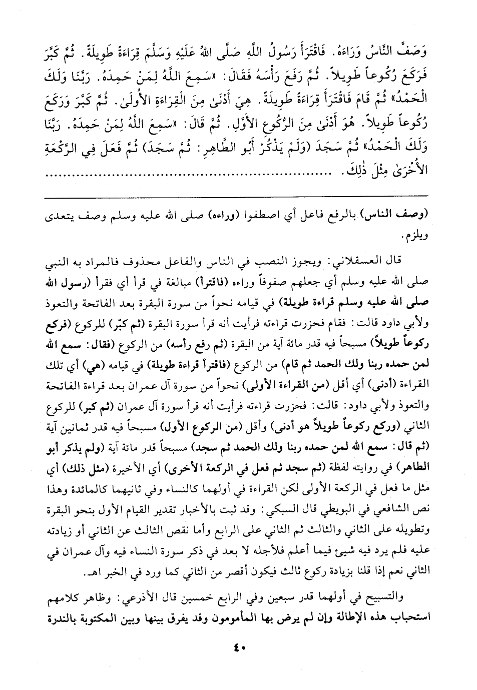 قال العسقلاني: ويجوز النصب في الناس والفاعل محذوف فالمراد به النبي صلى الله عليه وسلم أي جعلهم صفوفًا وراءه (فاقترأ) مبالغة في قرأ أي فقرأ (رسول الله صلى الله عليه وسلم قراءة طويلة) في قيامه نحوًا من سورة البقرة بعد الفاتحة والتعوذ ولأبي داود قالت: فقام فحزرت قراءته فرأيت أنه قرأ سورة البقرة (ثم كبَّر) للركوع (فركع ركوعًا طويلًا) مسبحًا فيه قدر مائة آية من البقرة (ثم رفع رأسه) من الركوع (فقال: سمع الله لمن حمده ربنا ولك الحمد ثم قام) من الركوع (فاقترأ قراءة طويلة) في قيامه (هي) أي تلك القراءة (أدنى) أي أقل (من القراءة الأولى) نحوًا من سورة آل عمران بعد قراءة الفاتحة والتعوذ ولأبي داود: قالت: فحزرت قراءته فرأيت أنه قرأ سورة آل عمران (ثم كبر) للركوع الثاني (وركع ركوعًا طويلًا هو أدنى) وأقل (من الركوع الأول) مسبحًا فيه قدر ثمانين آية (ثم قال: سمع الله لمن حمده ربنا ولك الحمد ثم سجد) مسبحًا قدر مانة آية (ولم يذكر أبو الطاهر) في روايته لفظة (ثم سجد ثم فعل في الركعة الأخرى) أي الأخيرة (مثل ذلك) أي مثل ما فعل في الركعة الأولى لكن القراءة في أولهما كالنساء وفي ثانيهما كالمائدة وهذا نص الشافعي في البويطي قال السبكي: وقد ثبت بالأخبار تقدير القيام الأول بنحو البقرة وتطويله على الثاني والثالث ثم الثاني على الرابع وأما نقص الثالث عن الثاني أو زيادته عليه فلم يرد فيه شيء فيما أعلم فلأجله لا بعد في ذكر سورة النساء فيه وآل عمران في الثاني نعم إذا قلنا بزيادة ركوع ثالث فيكون أقصر من الثاني كما ورد في الخبر اهـ.