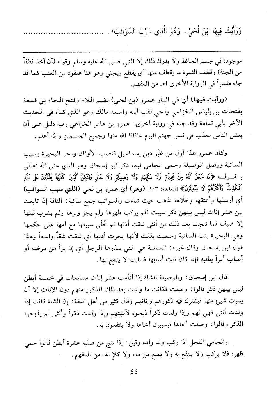 وكان عمرو هذا أول من غيَّر دين إسماعيل فنصب الأوثان وبحر البحيرة وسيب السائبة ووصل الوصيلة وحمى الحامي فيما ذكر ابن إسحاق وهو الذي عنى الله تعالى بقوله {مَا جَعَلَ اللَّهُ مِنْ بَحِيرَةٍ وَلَا سَائِبَةٍ وَلَا وَصِيلَةٍ وَلَا حَامٍ وَلَكِنَّ الَّذِينَ كَفَرُوا يَفْتَرُونَ عَلَى اللَّهِ الْكَذِبَ وَأَكْثَرُهُمْ لَا يَعْقِلُونَ} [المائدة: ١٠٣] (وهو) أي عمرو بن لحي (الذي سيب السوائب) أي أرسلها وأعتقها وخلّاها تذهب حيث شاءت والسوائب جمع سائبة: الناقة إذا تابعت بين عشر إناث ليس بينهن ذكر سيبت فلم يركب ظهرها ولم يجز وبرها ولم يشرب لبنها إلا ضيف فما نتجت بعد ذلك من أنثى شقت أذنها ثم خُلِّي سبيلها مع أمها على حكمها وهي البحيرة بنت السائبة وسميت بذلك لأنها بحرت أذنها أي شقت شقًا واسعًا وهذا قول ابن إسحاق وقال غيره: السائبة هي التي ينذرها الرجل أي إن برأ من مرضه أو أصاب أمرًا يطلبه فإذا كان ذلك أسابها فسابت لا ينتفع بها.