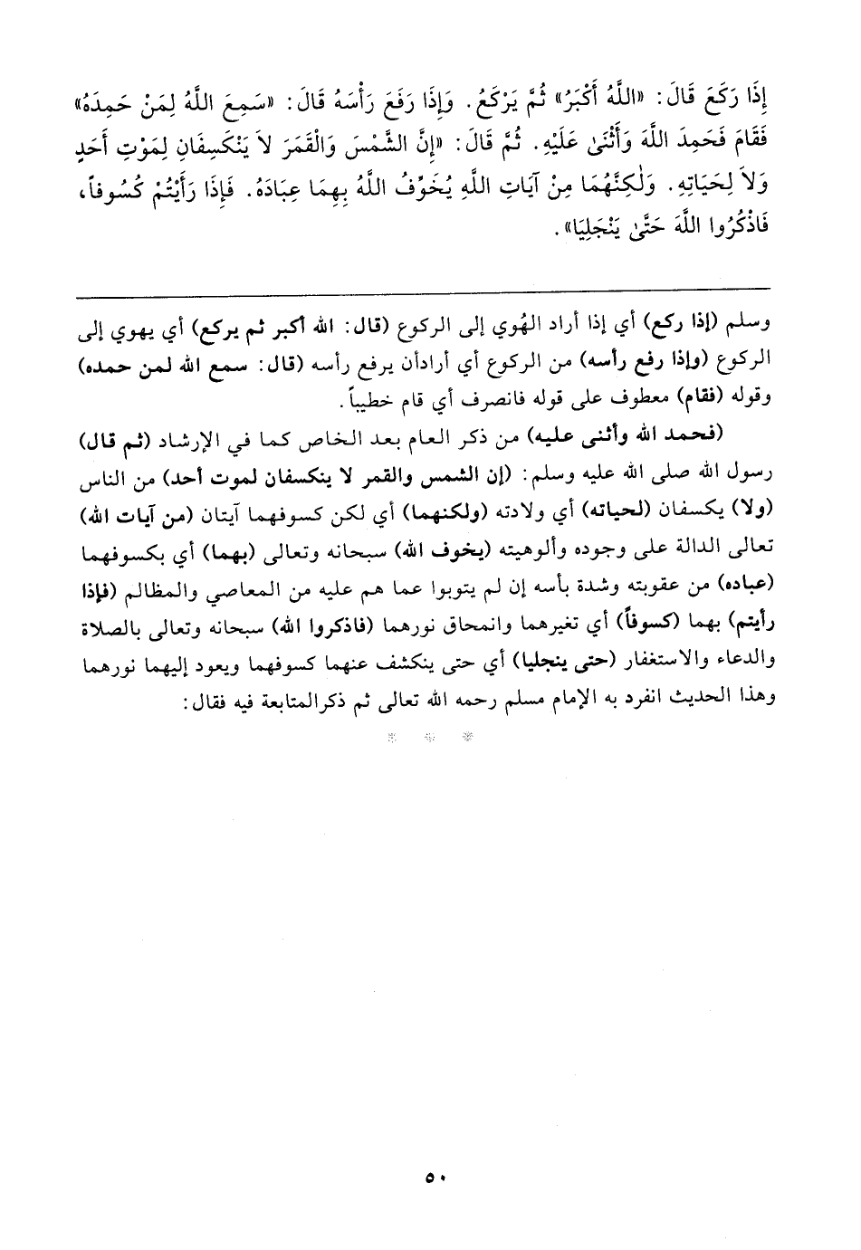 إِذَا رَكَعَ قَال: "اللَّهُ أَكْبَرُ" ثُمَّ يَرْكَعُ. وَإِذَا رَفَعَ رَأْسَهُ قَال: "سَمِعَ اللَّهُ لِمَنْ حَمِدَهُ" فَقَامَ فَحَمِدَ اللَّهَ وَأَثْنَى عَلَيهِ. ثُمَّ قَال: "إِنَّ الشَّمْسَ وَالْقَمَرَ لَا يَكْسِفَانِ لِمَوْتِ أَحَدٍ وَلَا لِحَيَاتِهِ. وَلَكِنَّهُمَا مِنْ آيَاتِ اللَّهِ يُخَوِّفُ اللَّهُ بِهِمَا عِبَادَهُ. فَإِذَا رَأَيتُمْ كُسُوفًا, فَاذْكُرُوا اللَّهَ حَتَّى يَنْجَلِيَا"