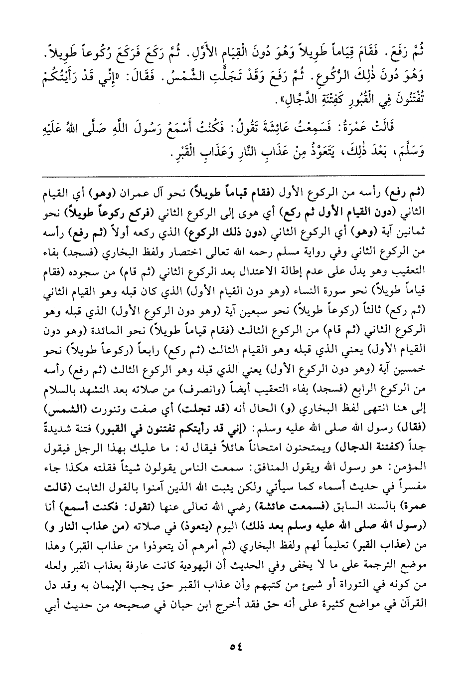 ثُمَّ رَفَعَ. فَقَامَ قِيَامًا طَويلًا وَهُوَ دُونَ الْقِيَامِ الأَوَّلِ. ثُمَّ رَكَعَ فَرَكَعَ رُكُوعًا طَويلًا. وَهُوَ دُونَ ذَلِكَ الرُّكُوعِ. ثُمَّ رَفَعَ وَقَدْ تَجَلَّتِ الشَّمْسُ. فَقَال: "إِنِّي قَدْ رَأَيتُكُمْ تُفْتَنُونَ فِي الْقُبُورِ كَفِتْنَةِ الدَّجَّالِ".