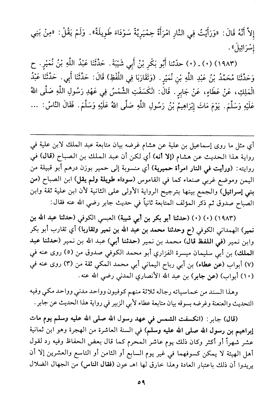 (١٩٨٣) (٠) - (٠) حَدَّثَنَا أَبُو بَكْرِ بْنُ أَبِي شَيبَةَ. حَدَّثَنَا عَبْدُ اللَّهِ بْنُ نُمَيرٍ. ح وَحَدَّثَنَا مُحَمَّدُ بْنُ عَبْدِ اللَّهِ بْنِ نُمَيرٍ. (وَتَقَارَبَا فِي اللَّفْظِ) قَال: حَدَّثَنَا أَبِي. حَدَّثَنَا عَبْدُ الْمَلِكِ، عَنْ عَطَاءٍ، عَنْ جَابِرٍ. قَال: انْكَسَفَتِ الشَّمْسُ فِي عَهْدِ رَسُولِ اللَّهِ صلى الله عليه وسلم. يَوْمَ مَاتَ إِبْرَاهِيمُ ابْنُ رَسُولِ اللَّهِ صلى الله عليه وسلم. فَقَال النَّاسُ: