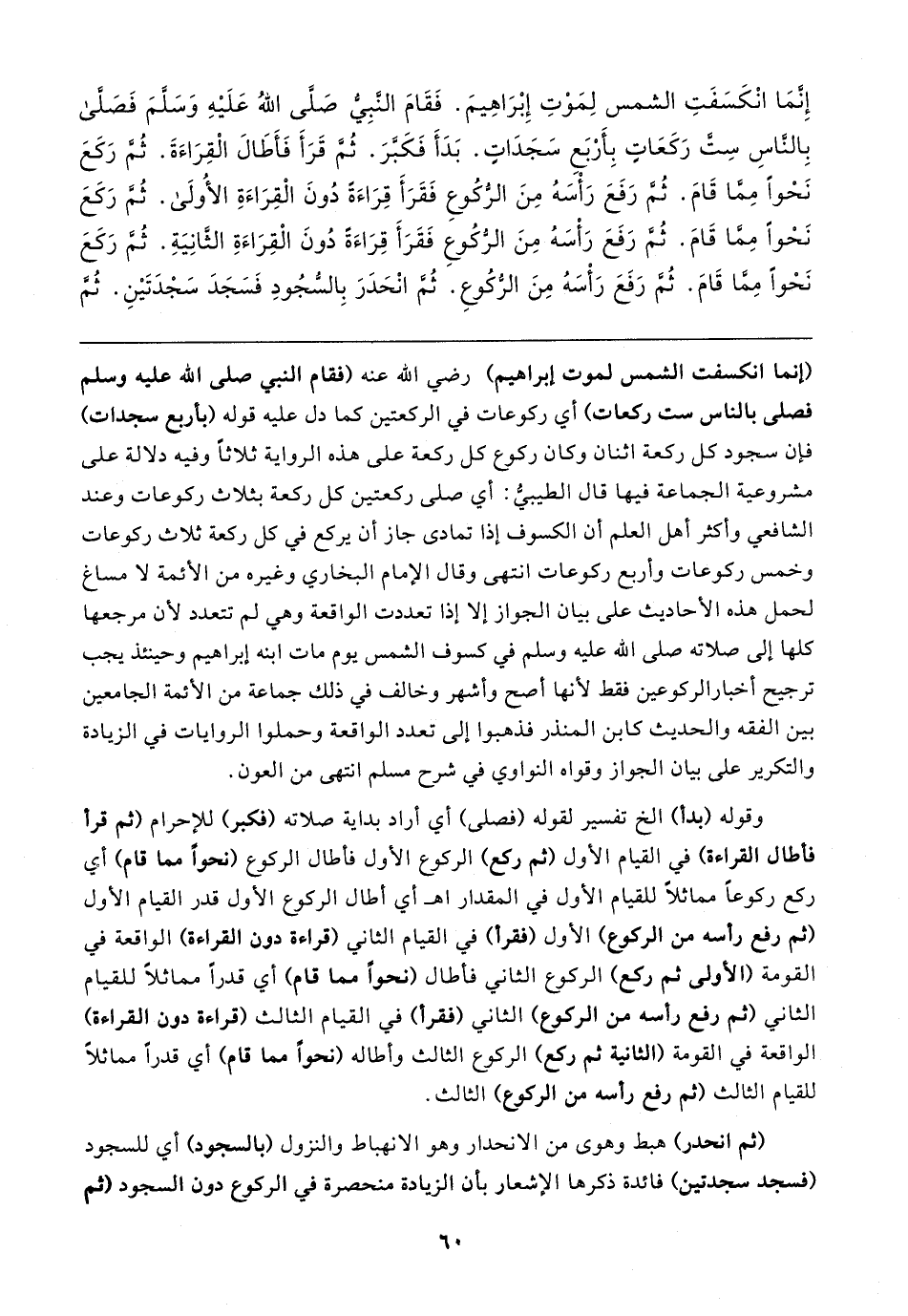 إِنَّمَا انْكَسَفَتْ الشمس لِمَوْتِ إِبْرَاهِيمَ. فَقَامَ النَّبِيُّ صلى الله عليه وسلم فَصَلَّى بِالنَّاسِ سِتَّ رَكَعَاتٍ بِأَرْبَعِ سَجَدَاتٍ. بَدَأَ فَكَبَّرَ. ثُمَّ قَرَأَ فَأَطَال الْقِرَاءَةَ. ثُمَّ رَكَعَ نَحْوًا مِمَّا قَامَ. ثُمَّ رَفَعَ رَأْسَهُ مِنَ الرُّكُوعِ فَقَرَأَ قِرَاءَةً دُونَ الْقِرَاءَةِ الأُولَى. ثُمَّ رَكَعَ نَحْوًا مِمَّا قَامَ. ثُمَّ رَفَعَ رَأْسَهُ مِنَ الرُّكُوعِ فَقَرَأَ قِرَاءَةً دُونَ الْقِرَاءَةِ الثَّانِيَةِ. ثُمَّ رَكَعَ نَحْوًا مِمَّا قَامَ. ثُمَّ رَفَعَ رَأْسَهُ مِنَ الرُّكُوعِ. ثُمَّ انْحَدَرَ بِالسُّجُودِ فَسَجَدَ سَجْدَتَينِ. ثُمَّ