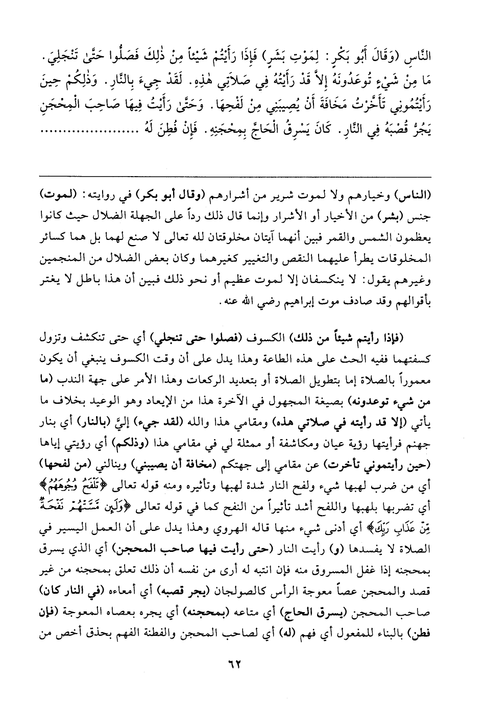 النَّاسِ (وَقَال أَبُو بَكْرٍ: لِمَوْتِ بَشَرٍ) فَإِذَا رَأَيتُمْ شَيئًا مِنْ ذَلِكَ فَصَلُّوا حَتَّى تَنْجَلِيَ. مَا مِنْ شَيْءٍ تُوعَدُونَهُ إِلَّا قَدْ رَأَيتُهُ فِي صَلاتِي هَذِهِ. لَقَدْ جِيءَ بِالنَّارِ. وَذَلِكُمْ حِينَ رَأَيتُمُونِي تَأَخَّرْتُ مَخَافَةَ أَنْ يُصِيبَنِي مِنْ لَفْحِهَا. وَحَتَّى رَأَيتُ فِيهَا صَاحِبَ الْمِحْجَنِ يَجُرُّ قُصْبَهُ فِي النَّارِ. كَانَ يَسْرِقُ الْحَاجَّ بِمِحْجَنِهِ. فَإِنْ فُطِنَ لَهُ