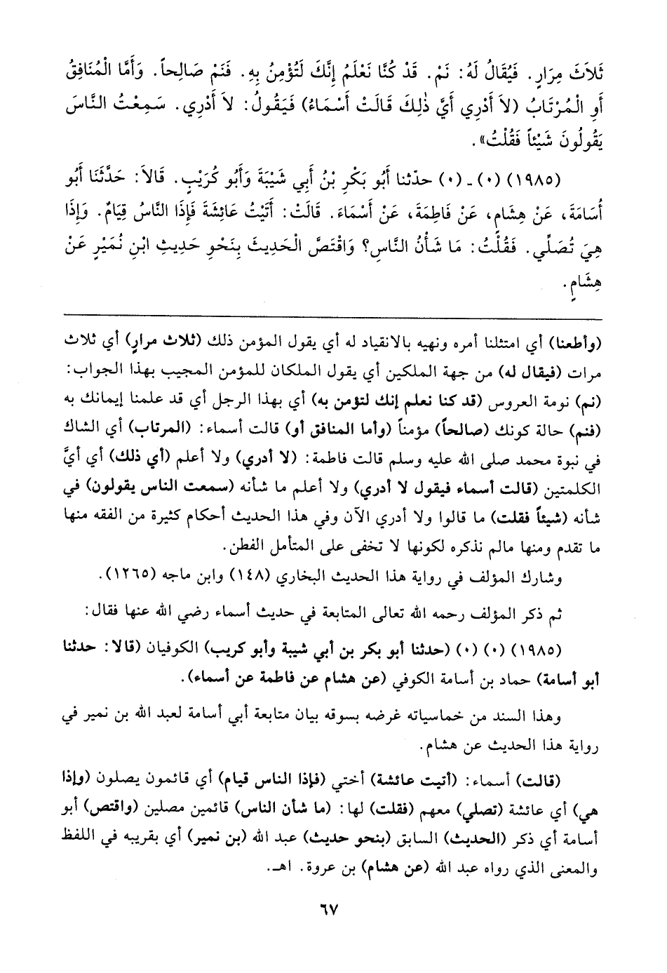 ثَلاثَ مِرَارٍ. فَيُقَالُ لَهُ: نَمْ. قَدْ كُنا نَعْلَمُ إنكَ لَتُؤْمِنُ بِهِ. فَنَمْ صَالِحًا. وَأَمّا الْمُنَافِقُ أَو الْمُرْتَابُ (لَا أَدْرِي أَيَّ ذلِكَ قَالتْ أَسْمَاءُ) فَيَقُولُ: لَا أَدْرِي. سَمِعْتُ النَّاسَ يَقُولُونَ شَيئا فَقُلْتُ".