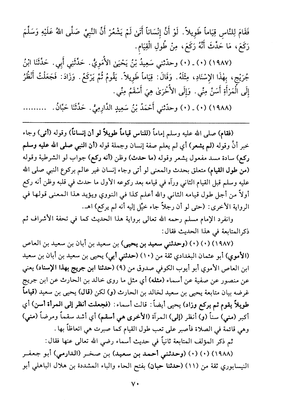 (١٩٨٧) (٠) (٠) (وحدثني سعيد بن يحيى) بن سعيد بن أبيان بن سعيد بن العاص (الأموي) أبو عثمان البغدادي ثقة من (١٠) (حدثني أبي) يحيى بن سعيد بن أبيان بن سعيد بن العاص الأموي أبو أيوب الكوفي صدوق من (٩) (حدثنا ابن جريج بهذا الإسناد) يعني عن منصور عن صفية عن أسماء (مثله) أي مثل ما روى خالد بن الحارث عن ابن جريج غرضه بيان متابعة يحيى بن سعيد لخالد بن الحارث (و) لكن (قال) يحيى بن سعيد (قيامًا طويلًا يقوم ثم يركع وزاد) يحيى أيضًا: قالت أسماء: (فجعلت انظر إلى المرأة أسن) أي أكبر (مني) سنًّا (و) انظر (إلى) المرآة (الأخرى هي أسقم) أي أشد سقمًا ومرضًا (مني) وهي قائمة في الصلاة فأصبر على تعب طول القيام كما صبرت هي اتعاظًا بها.