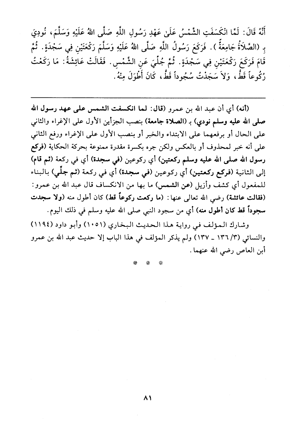 أَنَّهُ قَال: لَمَّا انْكَسَفَتِ الشمْسُ عَلَى عَهْدِ رَسُولِ الله - صلى اللهُ عَلَيهِ وَسلمَ-، نُودِيَ بِـ (الصَّلاةُ جَامِعَة). فَرَكَعَ رَسُولُ الله - صلى اللهُ عَلَيهِ وَسلمَ- رَكْعَتَينِ في سَجْدَةٍ. ثُمّ قَامَ فَرَكَعَ رَكْعَتَينِ في سَجْدَةٍ. ثُمَّ جُلِّيَ عَنِ الشمْسِ. فَقَالتْ عَائِشَةُ: مَا رَكَعْتُ رُكُوعًا قَطُّ، وَلَا سَجَدْتُ سُجُودًا قَطُّ، كَانَ أَطْوَلَ مِنْهُ