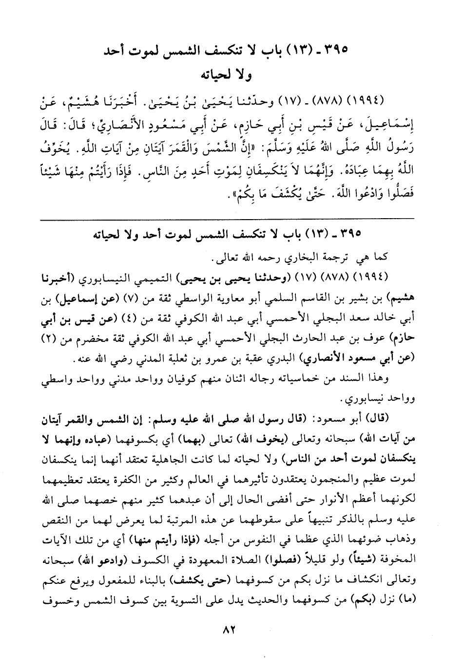 (١٩٩٤) (٨٧٨) (١٧) وحدّثنا يَحْيَى بْنُ يَحْيَى. أَخْبَرَنَا هُشَيمٌ، عَنْ إِسْمَاعِيلَ، عَنْ قَيسِ بْنِ أَبِي حَازِم، عَنْ أَبِي مَسعود الأنصَارِي؛ قَال: قَال رَسُولُ الله -صَلْى اللهُ عَلَيهِ وَسلمَ-: "إِن الشمْسَ وَالْقَمَرَ آيَتَانِ مِنْ آيَاتِ اللهِ. يُخَوِّفُ اللهُ بِهِمَا عِبَادَهُ. وإِنَّهُمَا لَا يَنْكَسِفَانِ لِمَوْتِ أَحَدٍ مِنَ الناسِ. فَإِذَا رَأَيتُمْ مِنْهَا شَيئًا فَصَلُّوا وَادْعُوا اللهَ. حَتى يُكْشَفَ مَا بِكُمْ"