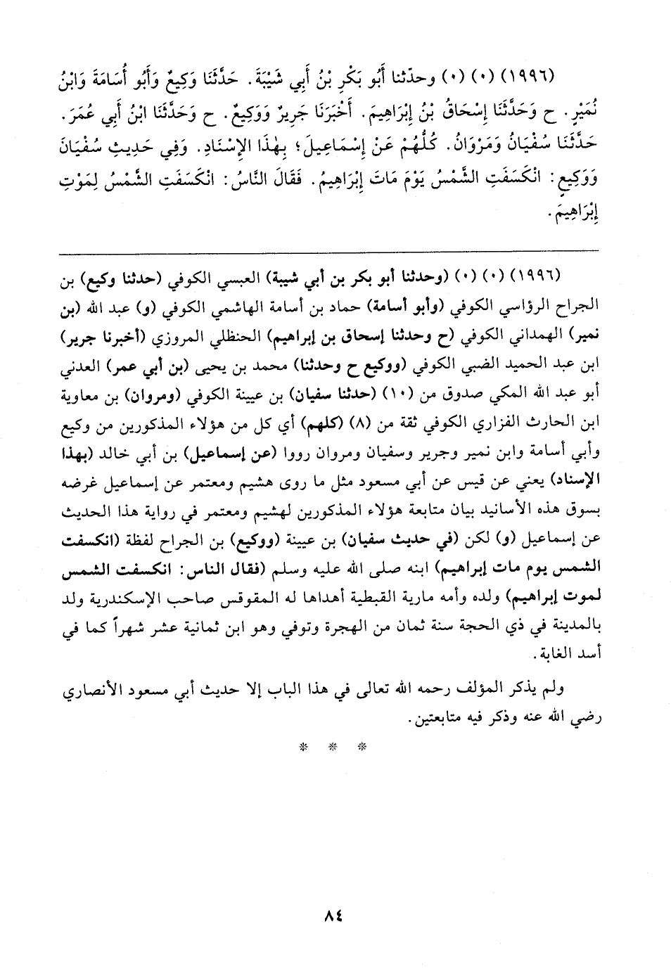 (١٩٩٦) (٠) (٠) وحدّثنا أَبُو بَكْرِ بْنُ أَبِي شَيبَةَ. حَدَّثَنَا وكيع وَأَبُو أُسَامَةَ وَابْنُ نُمَيرٍ. ح وَحَدَّثَنَا إِسْحَاقُ بْنُ إِبْرَاهِيمَ. أَخْبَرَنَا جَرِيرٌ وَوَكِيعٌ. ح وَحَدَّثَنَا ابْنُ أَبِي عُمَرَ. حَدَّثَنَا سُفْيَانُ وَمَرْوَانُ. كُلُّهُمْ عَنْ إِسْمَاعِيلَ؛ بِهذَا الإِسْنَادِ. وَفِي حَدِيثِ سُفْيَانَ وَوَكِيعٍ: انْكَسَفَتِ الشمْسُ يَوْمَ مَاتَ إِبْرَاهِيمُ. فَقَال النَّاسُ: انْكَسَفَتِ الشَّمْسُ لِمَوْتِ إِبْرَاهِيمَ