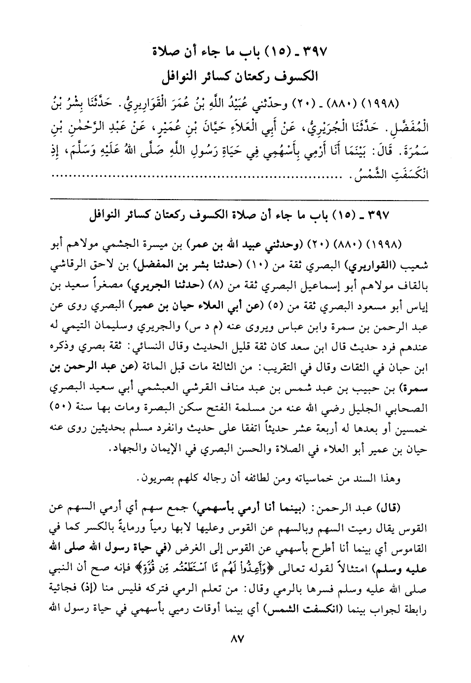 (١٩٩٨) (٨٨٠) (٢٠) وحدّثني عُبَيدُ الله بْنُ عُمَرَ الْقَوَارِيرِيُّ. حَدَّثَنَا بِشْرُ بْنُ الْمُفَضَّلِ. حَدَّثَنَا الْجُرَيرِيُّ، عَنْ أَبِي الْعَلاءِ حَيانَ بْنِ عُمَيرٍ، عَنْ عَبْدِ الرَّحْمنِ بْنِ سَمُرَةَ. قَال: بَينَمَا أنَّا أَرْمِي بِأَسْهُمِي في حَيَاةِ رَسُول الله -صلَّى اللهُ عَلَيهِ وَسَلَّمَ-، إِذِ انْكَسَفَتِ الشَّمْسُ