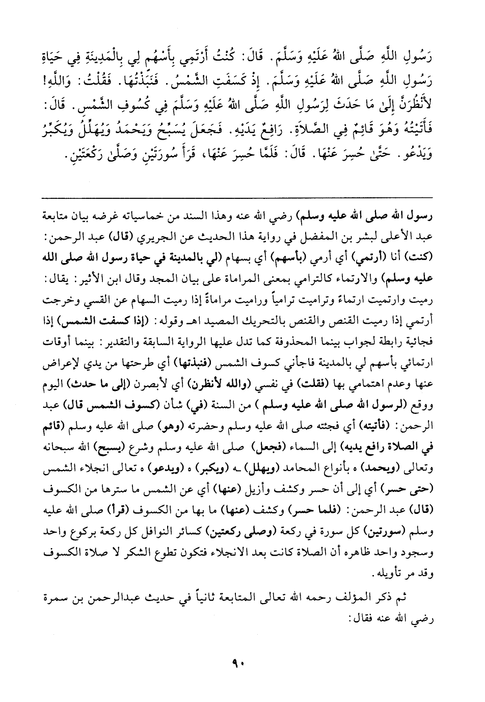 رسول الله - صلى الله عليه وسلم -) - رضي الله عنه - وهذا السند من خماسياته غرضه بيان متابعة عبد الأعلى لبشر بن المفضل في رواية هذا الحديث عن الجريري (قال) عبد الرحمن: (كنت) أنا (أرتمي) أي أرمي (بأسهم) أي بسهام (لي بالمدينة في حياة رسول الله - صلى الله عليه وسلم -) والارتماء كالترامي بمعنى المراماة على بيان المجد وقال ابن الأثير: يقال: رميت وارتميت ارتماءً وتراميت تراميًا وراميت مراماةً إذا رميت السهام عن القسط وخرجت أرتمي إذا رميت القنص والقنص بالتحريك المصيد اهـ وقوله: (إذا كسفت الشمس) إذا فجائية رابطة لجواب بينما المحذوفة كما تدل عليها الرواية السابقة والتقدير: بينما أوقات ارتمائي بأسهم لي بالمدينة فاجأني كسوف الشمس (فنبذتها) أي طرحتها من يدي لإعراض عنها وعدم اهتمامي بها (فقلت) في نفسي (والله لأنظرن) أي لأبصرن (إلى ما حدث) اليوم ووقع (لرسول الله - صلى الله عليه وسلم) من السنة (في) شأن كسوف الشمس قال) عبد الرحمن: (فأتيته) أي فجئته - صلى الله عليه وسلم - وحضرته (وهو) - صلى الله عليه وسلم - (قائم في الصلاة رافع يديه) إلى السماء (فجعل) - صلى الله عليه وسلم - وشرع (يسبح) الله سبحانه وتعالى (ويحمد) هـ بأنواع المحامد (ويهلل) ـه (ويكبر) (ويدعو) تعالى انجلاء الشمس (حتى حسر) أي إلى أن حسر وكشف وأزيل (عنها) أي عن الشمس ما سترها من الكسوف (قال) عبد الرحمن: (فلما حسر) وكشف (عنها) ما بها من الكسوف (قرأ) - صلى الله عليه وسلم - (سورتين) كل سورة في ركعة (وصلى ركعتين) كسائر النوافل كل ركعة بركوع واحد وسجود واحد ظاهره أن الصلاة كانت بعد الانجلاء فتكون تطوع الشكر لا صلاة الكسوف وقد مر تأويله.