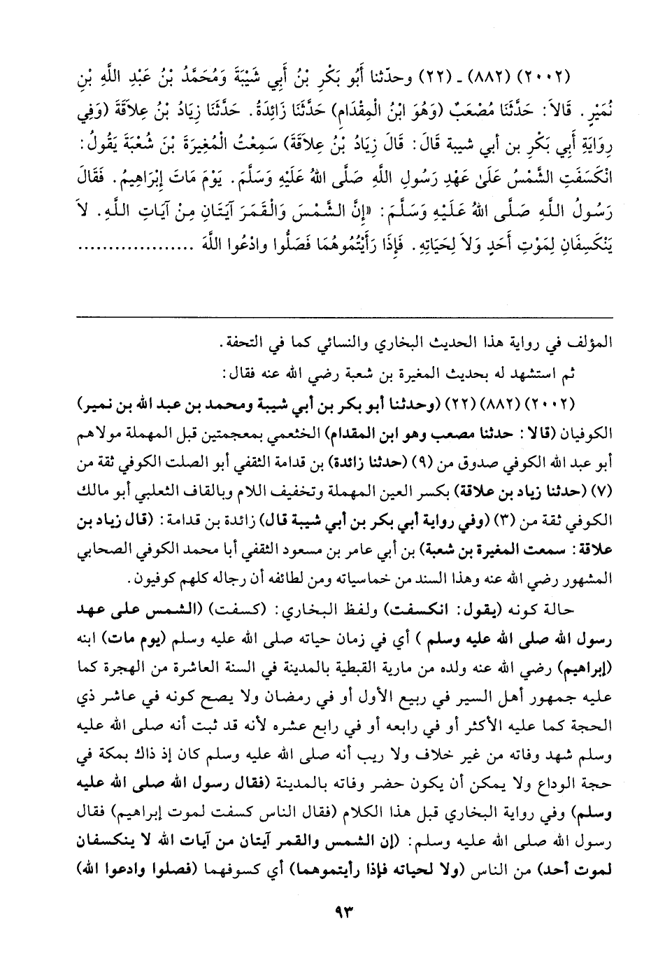 (٢٠٠٢) (٨٨٢) - (٢٢) وحدّثنا أَبُو بَكْرِ بْنُ أَبِي شَيبَةَ وَمُحَمَّدُ بْنُ عَبْدِ الله بْنِ نُمَيرٍ. قَالا: حَدَّثَنَا مُصْعَبٌ (وَهُوَ ابْنُ الْمِقْدَامِ) حَدَّثَنَا زَائِدَةُ. حَدَّثَنَا زِيَادُ بْنُ عِلاقَةَ (وَفِي رِوَايَةِ أَبِي بَكْرِ بن أبي شيبة قَال: قَال زِيَادُ بْنُ عِلاقَةَ) سَمِعْتُ الْمُغِيرَةَ بْنَ شُعْبَةَ يَقُولُ: انْكَسَفَتِ الشَّمْسُ عَلَى عَهْدِ رَسُول الله - صلى اللهُ عَلَيهِ وَسلمَ-. يَوْمَ مَاتَ إِبْرَاهِيمُ. فَقَال. رَسُول الله - صلى اللهُ عَلَيهِ وَسلمَ-: "إِن الشمْسَ وَالْقَمَرَ آيَتَانِ مِنْ آيَاتِ الله. لَا يَنْكَسِفَانِ لِمَوْتِ أَحَدٍ وَلَا لِحَيَاتِهِ. فَإِذَا رَأَيتُمُوهُمَا فَصَلُّوا وادْعُوا الله